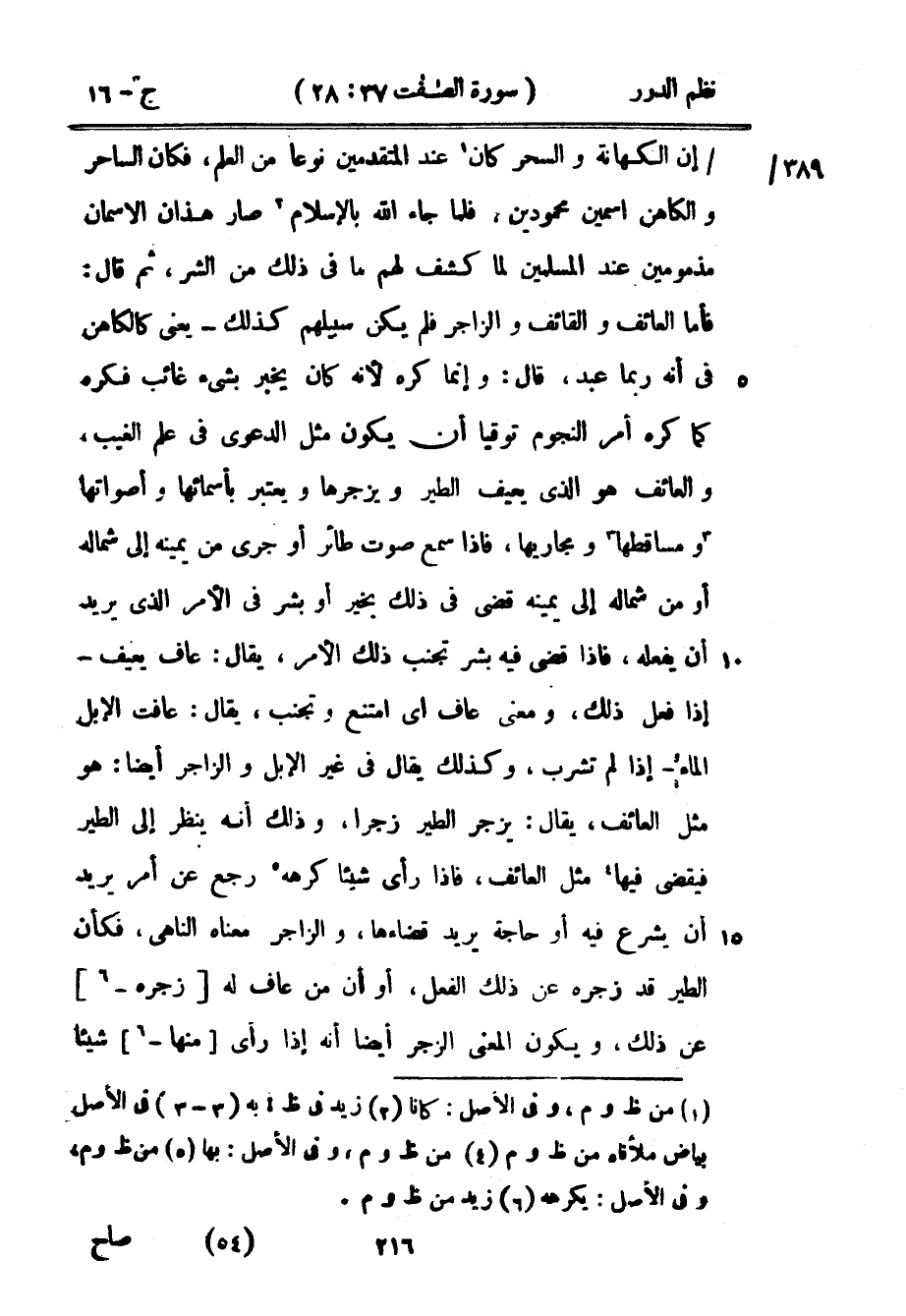 إن الكهانة والسحر كان عند المتقدمين نوعاً من العلم، فكان الساحر والكاهن اسمين محمودين، فلما جاء الله بالإسلام صار هذان الاسمان مذمومين عند المسلمين لما كشف لهم ما في ذلك من الشر، ثم قال: فأما العائف والقائف والزاجر فلم يكن سبيلهم كذلك - يعني كالكاهن في أنه ربما عبد، قال: وإنما كره لأنه كان يخبر بشيء غائب فكره كما كره أمر النجوم توقياً أن يكون مثل الدعوى في علم الغيب، والعائف هو الذي يعيف الطير ويزجرها ويعتبر بأسمائها وأصواتها ومساقطها ومجاريها، فإذا سمع صوت طائر أو جرى من يمينه إلى شماله أو من شماله إلى يمينه قضى في ذلك بخير أو بشر في الأمر الذي يريد أن يفعله، فإذا قضى فيه بشر تجنب ذلك الأمر، يقال: عاف يعيف - إذا فعل ذلك، ومعنى عاف أي امتنع وتجنب، يقال: عافت الإبل الماء - إذا لم تشرب، وكذلك يقال في غير الإبل الزاجر أيضاً: هو مثل العائف، يقال: يزجر أيضاً زجراً، وذلك أنه ينظر إلى الطير فيقضي فيها مثل العائف، فإذا رأى شيئاً كرهه رجع عن أمر يريد أن يشرع فيه أو حاجة يريد قضاءها، والزاجر معناه الناهي، فكأن الطير قد زجره عن ذلك الفعل، أو أن من عاف له زجره عن ذلك، ويكون المعنى الزجر أيضاً أنه إذا رأى منها شيئاً