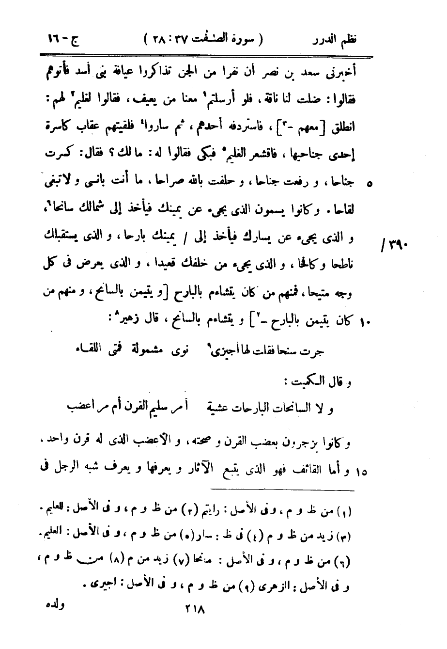 أخبرني سعد بن نصر أن نفراً من الجن تذاكروا عيافة بني أسد فأتوهم فقالوا: ضلت لنا ناقة، فلو أرسلتم معنا من يعيف، فقالوا لغليم لهم: انطلق معهم، فاستردفه أحدهم، ثم ساروا فلقيتهم عقاب كاسرة إحدى جناحيها، فاقشعر الغليم فبكى فقالوا له: ما لك؟ فقال: كسرت جناحاً، ورفعت جناحاً، وحلفت بالله صراحاً، ما أنت بإنسي ولا تبغي لقاحاً. وكانوا يسمون الذي يجيء عن يمينك فيأخذ إلى شمالك سانحاً، والذي يجيء عن يسارك فيأخذ غلى يمينك بارحاً، والذي يستقبلك ناطحاً وكافحاً، والذي يجيء من خلفك قعيداً، والذي يعرض في كل وجه متيحاً، فمنهم من كان يتشاءم بالبارح ويتيمن بالسانح، ومنهم من كان يتيمن بالبارح ويتشاءم بالسانح، قال زهير: