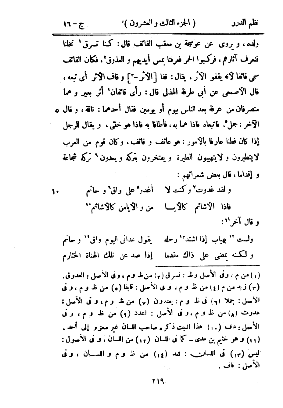 ولده، ويروى عن عوسجة ابن معقب القائف: قال: كنا تسرق نخلنا فنعرف آثارهم، فركبوا الحمر فعرفنا بمس أيديهم والعذوق، فكان القائف سمي قائفاً لأنه يقفو الأثر، يقال: قفا الأثر وقاف الأثر أي تبعه، قال الأصمعي عن أبي طرفة الهذلي قال: رأى قائفان أثر بعير وهما منصرفان من عرفة بعد الناس بيوم أو يومين فقال أحدهما: ناقة، وقال الآخر: جمل، فاتبعاه فإذا هما به، فاطافا به فإذا هو خنثى، ويقال للرجل إذا كان فطناً عارفاً بالأمور: هو عائف وقائف، وكان قوم من العرب لا يتطيرون ولا يتهيبون الطيرة ويفتخرون بتركه ويعدون تركه شجاعة وإقداماً، قال بعض شعرائهم: