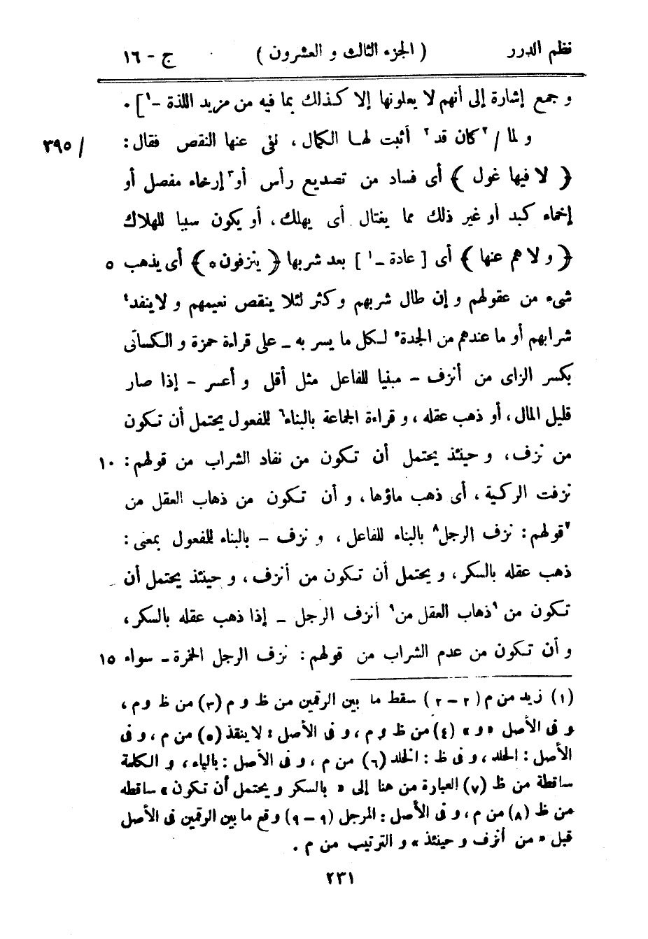 ولما كان قد أثبت لها الكمال، نفى عنها النقص فقال: {لا فيها غول} أي فساد من تصديع رأس أو إرخاء مفصل أو إخماء كبد أو غير ذلك مما يغتال أي يهلك، أو يكون سبباً للهلاك {ولا هم عنها} أي عادة بعد شربها {ينزفون *} أي يذهب شيء من عقولهم وإن طال شربهم وكثر لئلا ينقص نعيمهم ولا ينفذ شرابهم أو ما عندهم من الجدة لكل ما يسر به - على قراءة حمزة والكسائي بكسر الزاي من أنزف - مبنياً للفاعل مثل أقل وأعسر - إذا صار قليل المال، أو ذهب عقله، وقراءة الجماعة بالبناء للمفعول يحتمل أن تكون من نزف، وحينئذ يحتمل أن تكون من نفاذ الشراب من قولهم: نزفت الركية، اي ذهب ماؤها، وأن تكون من ذهاب العقل من قولهم: نزف الرجل بالبناء للفاعل ونزف بالبناء للمفعول بمعنى: ذهب عقله بالسكر ويحتمل أن تكون من أنزف وحينئذ يحتمل أن تكون من ذهاب العقل من أنزف الرجل - إذا ذهب عقله بالسكر، وأن تكون من عدم الشراب من قولهم: نزف الرجل الخمرة - سواء