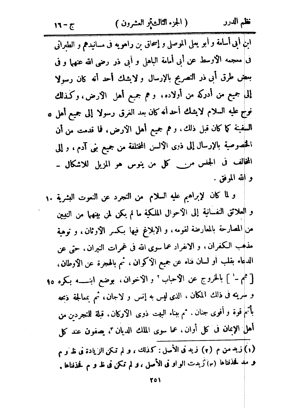 بن أبي أسامة وأبو يعلى الموصلي وإسحاق بن راهويه في مسانيدهم والطبراني في معجمه الأوسط عن أبي أمامة الباهلي وأبي ذر رضي الله عنهما وفي بعض طرق أبي ذر التصريح بالإرسال ولا يشك أحد أنه كان رسولاً إلى جميع من أدركه من أولاده، وهم جميع أهل الأرض، وكذلك نوح عليه السلام، لا يشك أحد أنه كان بعد الغرق رسولاً إلى جميع أهل السفينة كما كان قبل ذلك: وهم جميع أهل الأرض، فما قدمت من أن الخصوصية بالإرسال إلى ذوي الألسن المختلفة من جميع بني آدم، وإلى المخالف في الجنس من كل من ينوس هو المزيل للإشكال - والله الموفق.