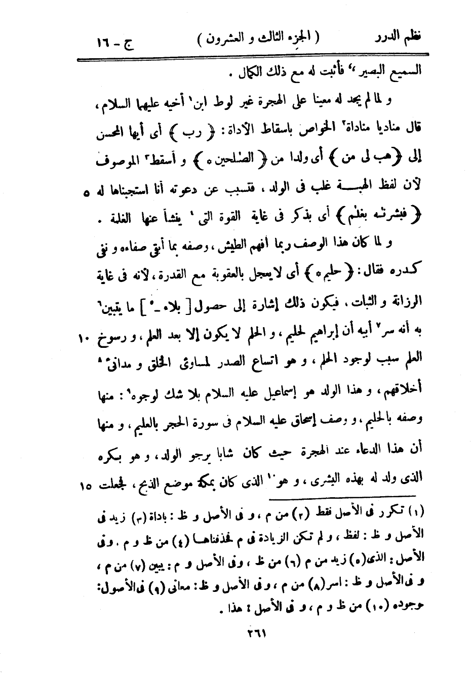 ولما كان هذا الوصف ربما أفهم الطيش، وصفه بما أبقى صفاءه ونفى كدره فقال: {حليم *} أي لا يعجل بالعقوبة مع القدرة، لأنه في غاية الرزانة والثبات، فيكون ذلك إشارة إلى حصول بلاء ما يتبين به أنه سر أبيه أن إبراهيم لحليم، والحلم لا يكون إلا بعد العلم، ورسوخ العلم سبب لوجود الحلم، وهو اتساع الصدر لمساوىء الخلق ومدانىء أخلاقهم، وهذا الولد هو إسماعيل عليه السلام بلا شك لوجوه: منها وصفه بالحليم، ووصف إسحاق عليه السلام في سورة الحجر بالعليم، ومنها أن هذا الدعاء عند الهجرة حيث كان شاباً يرجو الولد، وهو بكره الذي ولد له بهذه البشرى، وهو الذي كان بمكة موضع الذبح، فجعلت