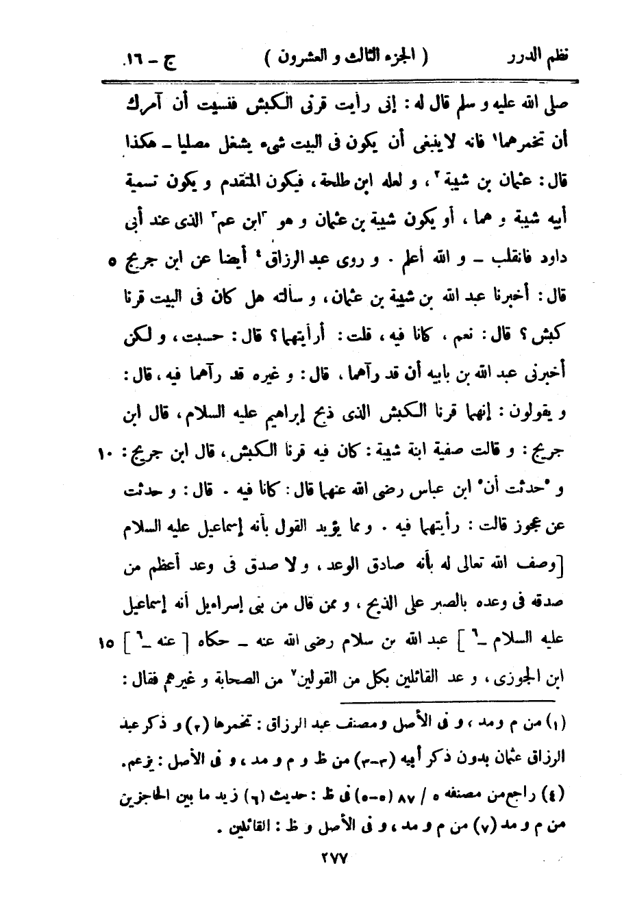 قال له: «إني رأيت قرني الكبش فنسيت أن آمرك أن تخمرهما فإنه لا ينبغي أن يكون في البيت شيء يشغل مصلياً» - هكذا قال: عثمان بن شيبة، ولعله ابن طلحة، فيكون المتقدم ويكون تسمية أبيه شيبة وهما، أو يكون شيبة بن عثمان وهو ابن عم الذي عند أبي داود فأنقلب - والله أعلم، وروى عبد الرزاق أيضاً عن ابن جريح قال: أخبرنا عبد الله بن شيبة بن عثمان، وسألته هل كان في البيت قرنا كبش؟ قال: نعم، كانا فيه، قلت: أرأيتهما؟ قال: حسبت، ولكن أخبرني عبد الله بن بابيه أن قد رآهما، قال: وغيره قد رآهما فيه، قال: ويقولون: إنهما قرنا الكبش الذي ذبح إبراهيم عليه السلام، قال ابن جريج وقالت صفية ابنة شيبة: كان فيه قرنا الكبش، قال ابن جريح: وحدثت أن ابن عباس رضي الله عنهما قال: كانا فيه. قال: وحدثت عن عجوز قلت: رأيتهما فيه، ومما يؤيد القول بأنه إسماعيل عليه السلام وصف الله تعالى له بأنه صادق الوعد، ولا صدق في وعد أعظم من صدقه في وعده بالصبر على الذبح، وممن قال من بني إسرائيل أنه إسماعيل عليه السلام عبد الله بن سلام رضي الله عنه - حكاه عن ابن الجوزي، وعد القائلين بكل من القولين من الصحابة وغيرهم فقال: