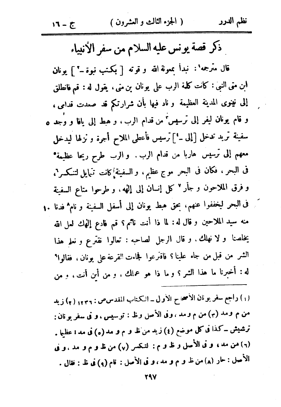 ذكر قصة يونس عليه السلام من سفر الأنبياء قال مترجمه: نبدأ بمعونة الله وقوته بكتب نبوة يونان بن متى النبي: كانت كلمة الرب على يونان بن متى، يقول له: قم فانطلق إلى نينوى المدينة العظيمة وناد فيها بأن شرارتكم قد صعدت قدامي، وقام يونان ليفر إلى ترسيس من قدام الرب، وهبط إلى يافا ووجد سفينة تريد تدخل إلى ترسيس فأعطى الملاح أجرة ونزلها ليدخل معهم إلى ترسيس هارباً من قدام الرب، والرب طرح ريحاً عظيمة في البحر، فكان في البحر موج عظيم، والسفينة كانت تتمايل لتنكسر وفرق الملاحون وجأر كل إنسان إلى إلهه، وطرحوا متاع السفينة في البحر ليخففوا عنهم، بحق هبط يونان إلى أسفل السفينة ونام فدنا منه سيد الملاحين وقال له: لماذا أنت نائم؟ قم فادع إلهك لعل الله يخلصنا ولا نهلك، وقال الرجل لصاحبه: تعالوا نقترع ونعلم هذا الشر من قبل من جاء علينا؟ فاقترعوا فجاءت القرعة على يونان، فقالوا له: أخبرنا ما هذا الشر؟ وماذا هو عملك، ومن أين أنت، ومن