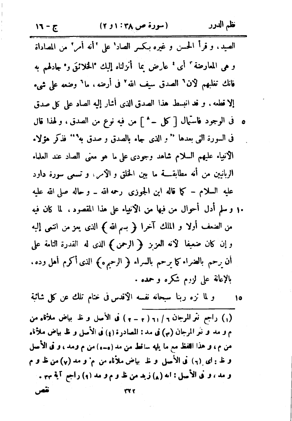 الصيد، وقرأ الحسن وغيره بكسر الصاد على أنه أمر من المصاداة وهي المعارضة أي عارض بما أنزلناه إليك الخلائق وجادلهم به فإنك تغلبهم لأن الصدق سيف الله في أرضه، ما وضعه على شيء إلا قطعه، وقد انبسط هذا الصدق الذي أشار إليه الصاد على كل صدق في الوجود فاستمال كل من فيه نوع من الصدق، ولهذا قال في السورة التي بعدها) والذي جاء بالصدق وصدق به) [الزمر: 33] فذكر هؤلاء الأنبياء عليهم السلام شاهد وجودي على ما هو معنى الصاد عند العلماء الربانيين من أنه مطابقة ما بين الخلق والأمر، وتسمى سورة داود عليه السلام - كما قاله ابن الجوزي رحمه الله - وحاله (صَلَّى اللهُ عَلَيْهِ وَسَلَّمَ) أدل أحوال من فيها من الأنبياء على هذا المقصود، لما كان فيه من الضعف أولا والملك آخرا) بسن الله (الذي يعز من انتمى إليه وإن كان ضعيفا لأن هـ العزيز) الرحمن (الذي له القدرة التامة على أن يرحم بالضراء كما يرحم بالسراء) الرحيم (الذي أكرم أهل وده، بالإعانة على لزوم شكره وحمده.
