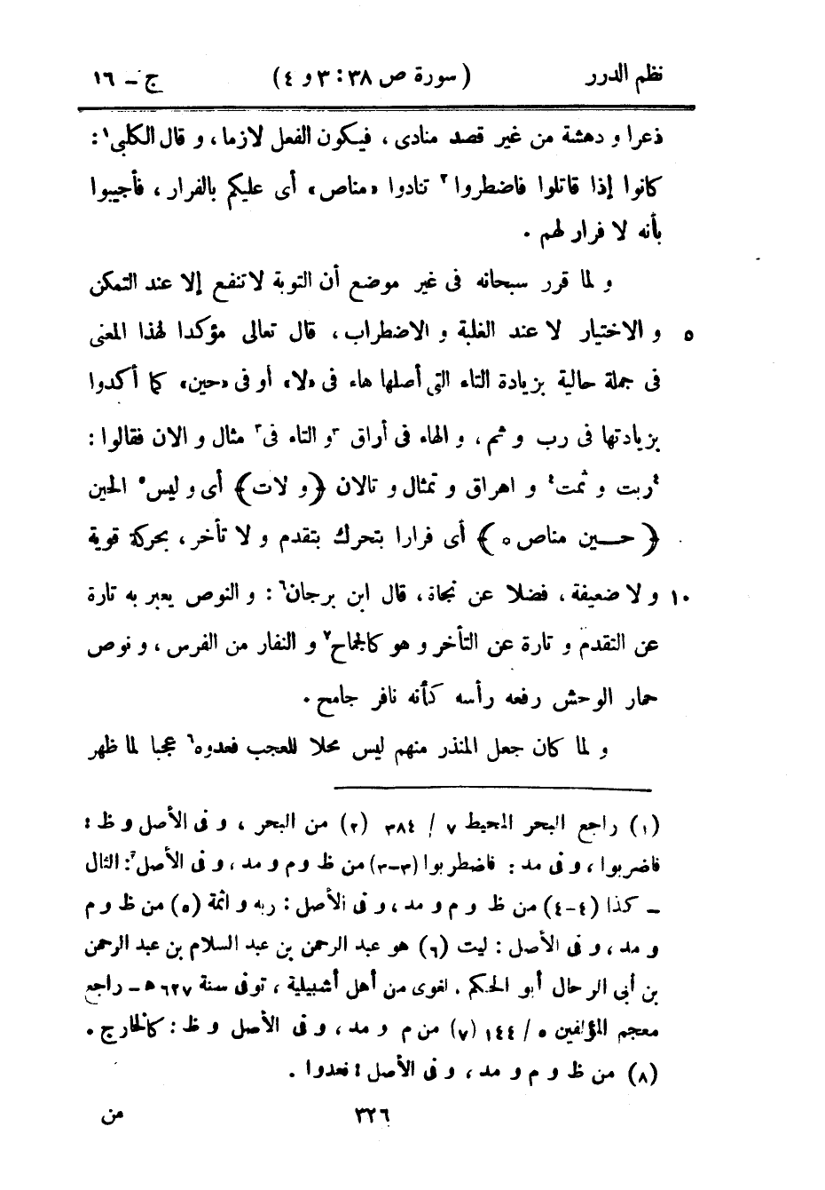 ولما قرر سبحانه في غير موضع أن التوبة لا تنفع إلا عند التمكن والاختيار لا عند الغلبة والاضطراب، قال تعالى مؤكداً لهذا المعنى في جملة حالية بزيادة التاء التي أصلها هاء في «لا» أو في «حين» كما أكدوا بزيادتها في رب وثم، والهاء في أراق والتاء في مثال والان فقالوا: ربت وثمت وأهراق وتمثال وتالان {ولات} أي وليس الحين {حين مناص *} أي فراراً بتحرك بتقدم ولا تأخر، بحركة قوية ولا ضعيفة، فضلاً عن نجاة، قال ابن برجان: والنوص يعبر به تارة عن التقدم وتارة عن التأخر وهو كالجماح والنفار من الفرس، ونوص حمار رفعه رأسه كأنه نافر جامح.