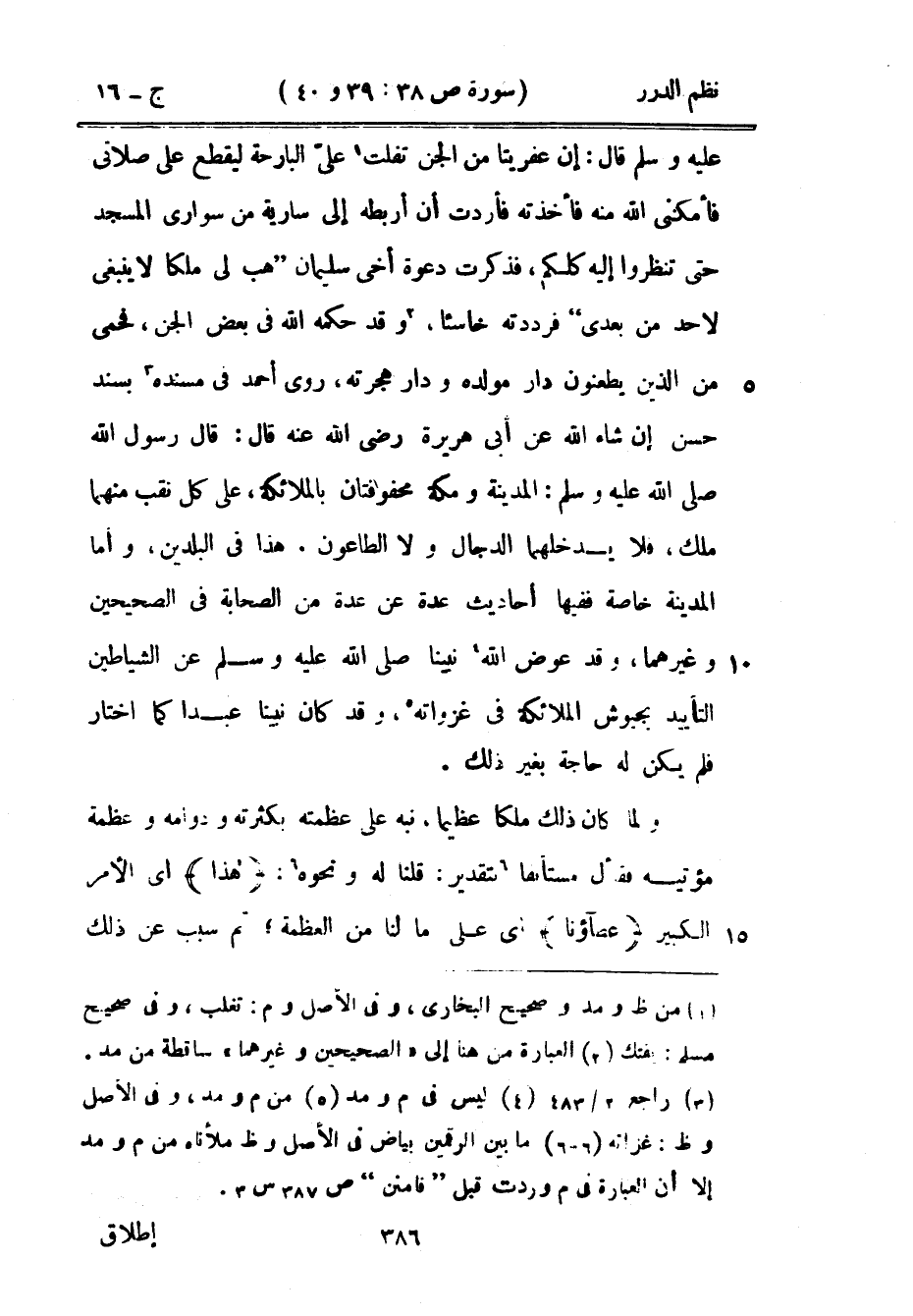 قال: «إن عفريتاً من الجن تفلت عليّ البارحة ليقطع علي صلاتي فأمكنني الله منه فأخذته فأردت أن أربطه إلى سارية من سواري المسجد حتى تنظروا إليه كلكم، فذكرت دعوة أخي سليمان {هب لي ملكاً لا ينبغي لأحد من بعدي} فرددته خاسئاً» ، وقد حكمه الله في بعض الجن، فحمي من الذين يطعنون دار مولده ودار هجرته، روى أحمد في مسنده بسند حسن إن شاء الله عن أبي هريرة رضي الله عنه قال: قال رسول الله صَلَّى اللهُ عَلَيْهِ وَسَلَّمَ: «المدينة ومكة محفوفتان بالملائكة، على كل نقب منهما ملك، فلا يدخلهما الدجال ولا الطاعون» هذا في البلدين، وأما المدينة خاصة ففيها أحاديث عدة عن عدة من الصحابة في الصحيحين وغيرهما، وقد عوض الله نبينا صَلَّى اللهُ عَلَيْهِ وَسَلَّمَ عن الشياطين التأييد بجيوش الملائكة في غزواته، وقد كان نبينا عبداً كما اختار فلم يكن له حاجة بغير ذلك.