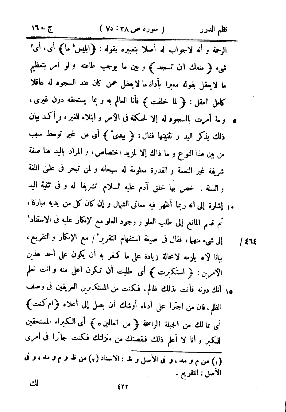 الرحمة، وأنه لا جواب له اصلاً بتعبيره بقوله: {إبليس ما} أي، أي شيء {منعك أن تسجد} وبين ما يوجب طاعته ولو أمر بتعظيم ما لا يعقل بقوله معبراً بأداة ما لا يعقل عمن كان عند السجود له عاقلاً كامل العقل: {لما خلقت} فأنا العالم به وبما يستحقه دون غيري، وما أمرت بالسجود له إلا لحكمة في الأمر وابتلاء للغير، وأكد بيان ذلك بذكر اليد وتثنيتها فقال: {بيدي} أي من غير توسط سبب من بين هذا النوع وما ذاك إلا لمزيد اختصاص، والمراد باليد هنا صفة شريفة غير النعمة والقدرة معلومة له سبحانه ولمن تبحر في علمي اللغة والسنّة، خص بها خلق آدم عليه السلام تشريفاً له وفي تثنية اليد إشارة إلى أنه ربما أظهر فيه معاني الشمال وإن كان كل من يديه مباركاً، ثم قسم المانع إلى طلب العلو ووجود العلو مع الإنكار عليه في الاستناد إلى شيء منهما، فقال في صيغة استفهام التقرير مع الإنكار والتقريع، بياناً لأنه يلزمه لا محالة زيادة على ما كفر به أن يكون على أحد هذين الأمرين: {أستكبرت} أي طلبت أن تكون أعلى منه وأنت تعلم أنك دونه فأنت بذلك ظالم، فكنت من المستكبرين العريقين في وصف الظلم، فإن من اجترأ على أدناه أوشك أن يصل إلى أعلاه {أم كنت} أي مما لك من الجبلة الراسخة {من العالين *} أي الكبراء المستحقين للكبر وأنا لا أعلم ذلك فنقصتك من منزلتك فكنت جائراً في أمري