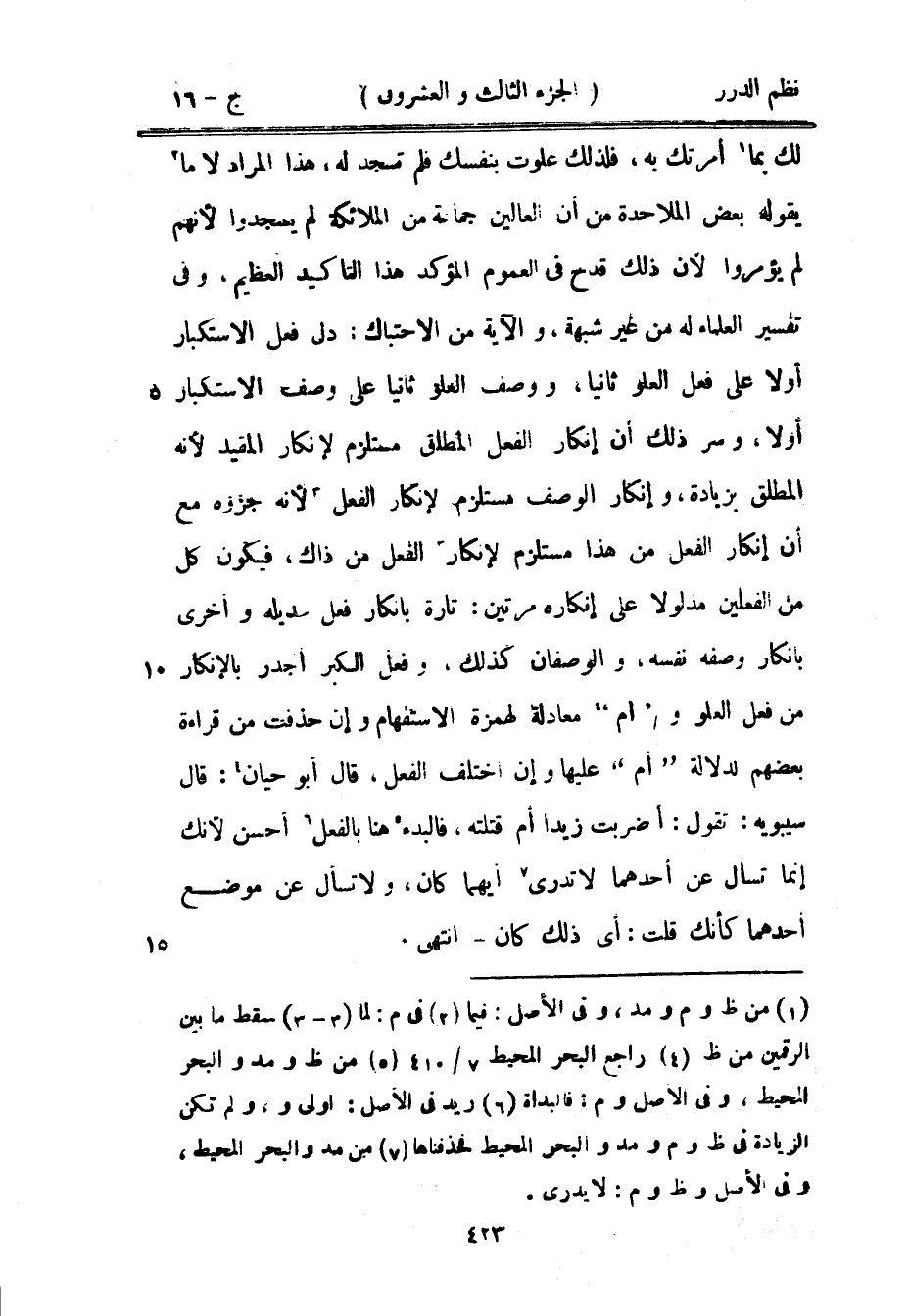 لك بما أمرتك به، فلذلك علوت بنفسك فلم تسجد له، هذا المراد لا ما يقوله بعض الملاحدة من أن العالين جماعة من الملائكة لم يسجدوا لأنهم لم يؤمروا لأن ذلك قدح في العموم المؤكد هذا التأكيد العظيم، وفي تفسير العلماء له من غير شبهة، والآية من الاحتباك؛ دل فعل الاستكبار أولاً على فعل العلو ثانياً، ووصف العلو ثانياً على وصف الاستكبار أولاً، وسر ذلك ان إنكار الفعل المطلق مستلزم لإنكار المقيد لأنه المطلق بزيادة، وإنكار الوصف مستلزم لإنكار الفعل لأنه جزوه مع أن إنكار الفعل من هذا مستلزم لإنكار الفعل من ذاك، فيكون كل من الفعلين مدلولاً على إنكاره مرتين: تارة بإنكار فعل عديله وأخرى بإنكار وصفه نفسه والوصفان كذلك وفعل الكبر أجدر بالإنكار من فعل العلو و «أم» معادلة لهمزة الاستفهام وإن حذفت من قراءة بعضهم لدلالة «أم» عليها وإن اختلف الفعل، قال أبو حيان: قال سيبويه: تقول: أضربت زيداً أم قتلته، فالبدء هنا بالفعل أحسن لأنك إنما تسأل عن أحدهما لا تدري أيهما كان، ولا تسأل عن موضع أحدهما كأنك قلت: أي ذلك كان - انتهى.