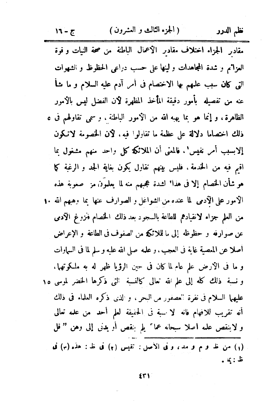 مقادير الجزاء اختلاف مقادير الأعمال الباطنة من صحة النيات وقوة العزائم وشدة المجاهدات ولينها على حسب دواعي الحظوظ والشهوات التي كان سبب علمهم بهذا الاختصام في أمر آدم عليه السلام وما نشأ عنه تفصيله بأمور دقيقة المأخذ المظهرة لأن الفضل ليس بالأمور الظاهرة وإنما هو بما يهبه الله من الأمور الباطنة وسمي تقاولهم في ذلك اختصاماً دلالة على عظمة ما تقاولوا فيه، لأن الخصومة لا تكون إلا بسبب أمر نفيس، فالمعنى أن الملائكة كل واحد منهم مشغول بما أقيم فيه من الخدمة، فليس بينهم تقاول يكون بغاية الجد والرغبة كما هو شأن الخصام إلا في هذا لشدة عجبهم منه لما يعملون من صعوبة هذه الأمور على الآدمي لما عنده من الشواغل والصوارف عنها بما وهبهم الله من العلم جزاء لانقيادهم للطاعة بالسجود بعد ذلك الخصام فنزوع الآدمي عن صوارفه وحظوظه إلى ما للملائكة من الصفوف في الطاعة والإعراض أصلاً عن المعصية غاية في العجب، وعلمه صَلَّى اللهُ عَلَيْهِ وَسَلَّمَ لما في السماوات وما في الأرض علم عام لما كان في حين الرؤيا ظهر له به ملكوتهما، ونسبة ذلك كله إلى علم الله تعالى كالنسبة التي ذكرها الخضر لموسى عليهما السلام في نفرة العصفور من البحر، والذي ذكره العلماء في ذلك أنه تقريب للإفهام فإنه لا نسبة في الحقيقة لعلم أحد من علمه تعالى ولا بنقص علمه أصلاً سبحانه عما يلم بنقص أو يدني إلى وهن