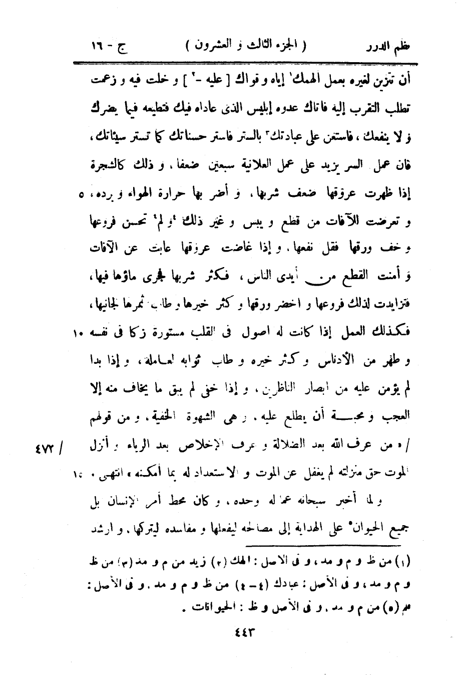 أن تتزين لغيره بعمل ألهمك إياه وقواك عليه وخلت فيه وزعمت تطلب التقرب إليه فأتاك عدوه إبليس الذي عاداه فيك فتطيعه فيما يضرك ولا ينفعك، فاستعن على عبادتك بالستر فاستر حسناتك كما تستر سيئاتك، فإن عمل السر يزيد على عمل العلانية سبعين ضعفاً، وذلك كالشجرة إذا ظهرت عروقها ضعف شربها، وأضر بها حرارة الهواء وبرده، وتعرضت للآفات من قطع ويبس وغير ذلك ولم تحسن فروعها وخف ورقها فقل نفعها، وإذا غاصت عروقها غابت عن الآفات وأمنت القطع من أيدي الناس، فكثر شربها فجرى ماؤها فيها، فتزايدت لذلك فروعها واخضر ورقها وكثر خيرها وطاب ثمرها لجانيها، فكذلك العمل إذا كانت له أصول في القلب مستورة زكا في نفسه وطهر من الأدناس وكثر خيره وطاب ثوابه لعامله، وإذا بدا لم يؤمن عليه من أبصار الناظرين، وإذا خفي لم يبق ما يخاف منه إلا العجب ومحبة أن يطلع عليه، وهي الشهوة الخفية، ومن قولهم «من عرف الله بعد الضلالة وعرف الإخلاص بعد الرياء وأنزل الموت حق منزلته لم يغفل عن الموت والاستعداد له بما أمكنه» انتهى.