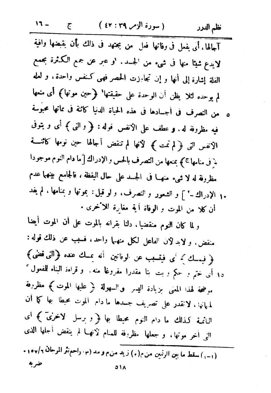 آجالها، أي يفعل في وفاتها فعل من يجتهد في ذلك بأن يقبضها وافية لا يدع شيئاً منها في شيء من الجسد، وعبر عن جمع الكثرة بجمع القلة إشارة إلى أنها وإن تجاوزت الحصر فهي كنفس واحدة، ولعله لم يوحده لئلا يظن أن الوحدة على حقيقتها {حين موتها} أي منعها من التصرف في أجسادها في هذه الحياة الدنيا كائنة في مماتها محبوسة فيه مظروفة له، وعطف على الأنفس قوله: {والتي} أي ويتوفى الأنفس التي {لم تمت} لأنها لم تنقض آجالها حين نومها كائنة {في منامها} بمنعها من التصرف بالحس والإدراك ما دام النوم موجوداً مظروفة له لا شيء منها في الجسد على حال اليقظة، فالجامع بينهما عدم الإدراك والشعور والتصرف، ولو قيل: بموتها وبمنامها، لم يفد أن كلاًّ من الموت والوفاة آية مغايرة للأخرى.