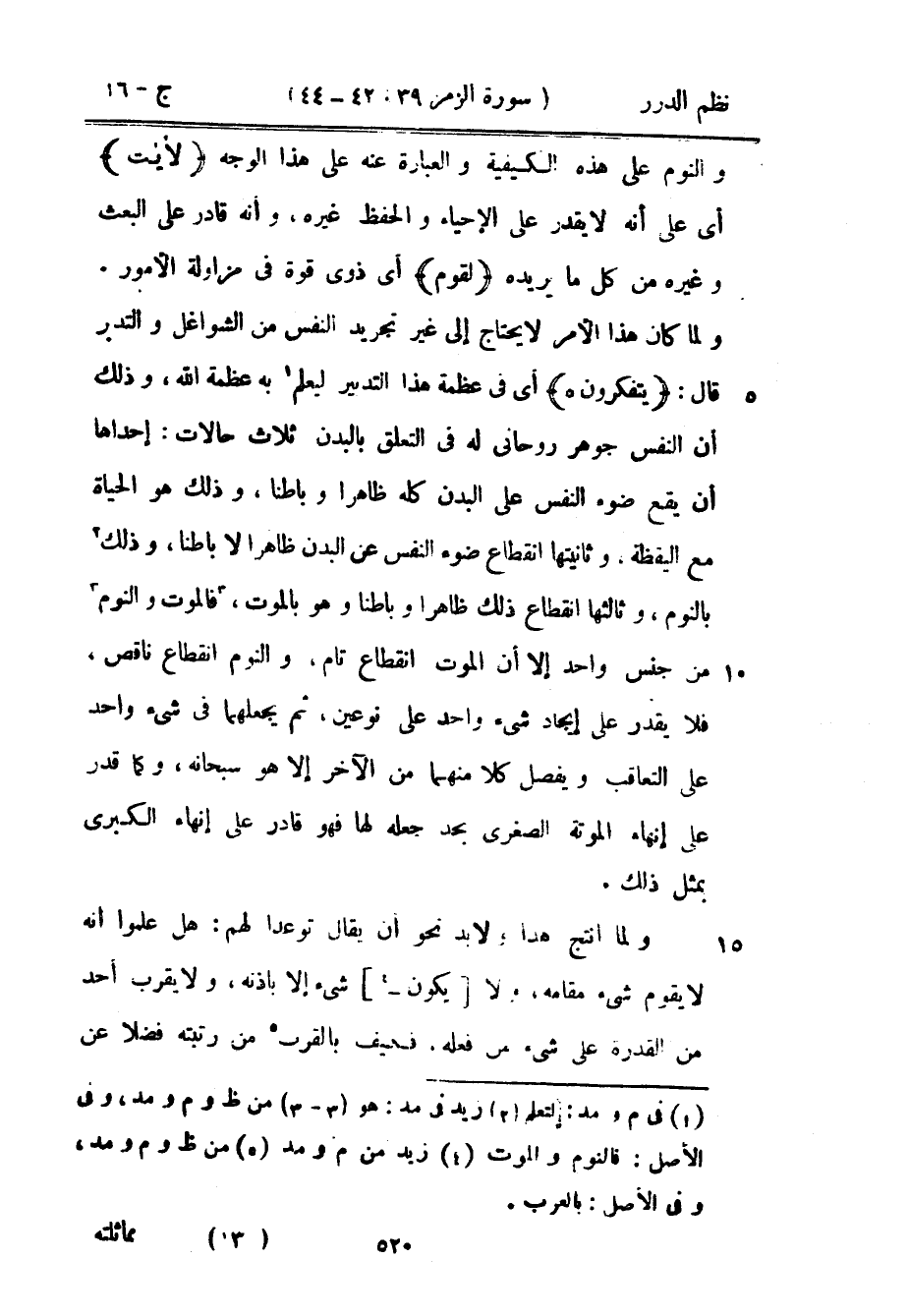 والنوم على هذه الكيفية والعبارة عنه على هذا الوجه {لآيات} أي على أنه لا يقدر على الإحياء والحفظ غيره، وأنه قادر على البعث وغيره من كل ما يريده {لقوم} أي ذوي قوة في مزاولة الأمور. ولما كان هذا الأمر لا يحتاج إلى غير تجريد النفس من الشواغل والتدبر قال: {يتفكرون *} أي في عظمة هذا التدبير ليعلم به عظمة الله، وذلك أن النفس جوهر روحاني له في التعلق بالبدن ثلاث حالات: إحداهما أن يقع ضوء النفس على البدن ظاهراً وباطناً، وذلك هو الحياة مع اليقظة، وثانيتها انقطاع ضوء النفس عن البدن ظاهراً لا باطناً، وذلك بالنوم، وثالثها انقطاع ذلك ظاهراً وباطناً وهو بالموت، فالموت والنوم من جنس واحد إلا أن الموت انقطاع تام، والنوم انقطاع ناقص، فلا يقدر على إيجاد شيء واحد على نوعين، ثم يجعلهما في شيء واحد على التعاقب ويفصل كلاًّ منهما من الآخر إلا هو سبحانه، وكلما قدر على إنهاء الموتة الصغرى بحد جعله لها فهو قادر على إنهاء الكبرى بمثل ذلك.