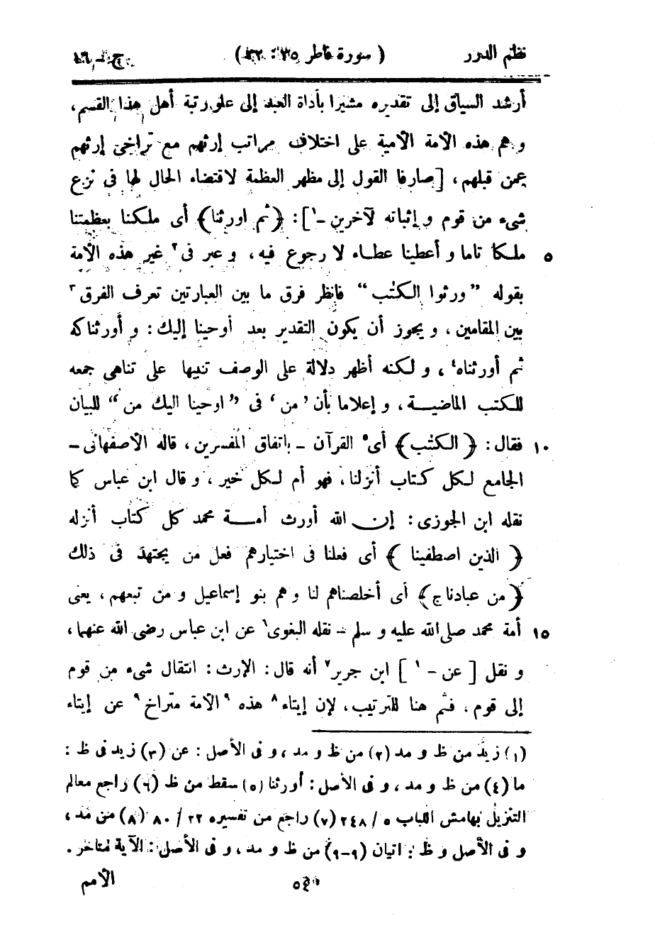 أرشد السياق إلى تقديره مشيراً بأداة العبد إلى علو رتبة أهل هذا القسم، وهم هذه الأمة الأمية على اختلاف مراتب إرثهم مع تراخي إرثهم عمن قبلهم، صارفاً القول إلى مظهر العظمة لاقتضاء الحال لها في نزع شيء من قوم وإثباته لآخرين: {ثم أورثنا} أي ملكنا بعظمتنا ملكاً تاماً وأعطينا عطاء لا رجوع فيه، وعبر في غير هذه الأمة {ورثوا الكتاب} [الأعراف: 169] فانظر فوق ما بين العبارتين تعرف الفرق بين المقامين، ويجوز أن يكون التقدير بعد ما أوحينا إليك: وأورثناكه ثم أورثناه، ولكنه أظهر دلالة على الوصف تنبيهاً على تناهي جمعه للكتب الماضية وإعلاماً بأن «من» في {أوحينا إليك من} للبيان فقال: {الكتاب} أي القرآن باتفاق المفسرين، قال الأصفهاني - الجامع لكل كتاب أنزلنا، فهو أم لكل خير، وقال ابن عباس كما نقله ابن الجوزي: إن الله أورث أمة محمد كل كتاب أنزله {الذين اصطفينا} أي فعلنا في اختيارهم فعل من يجتهد في ذلك {من عبادنا} أي أخلصناهم لنا وهم بنو إسماعيل ومن تبعهم، يعني أمة محمد صَلَّى اللهُ عَلَيْهِ وَسَلَّمَ - نقله البغوي عن ابن عباس رضي الله عنهما، ونقل عن ابن جرير أنه قال: الإرث: انتقال شيء من قوم إلى قوم، فثم هنا للترتيب، لأن إيتاء هذه الأمة متراخ عن إيتاء
