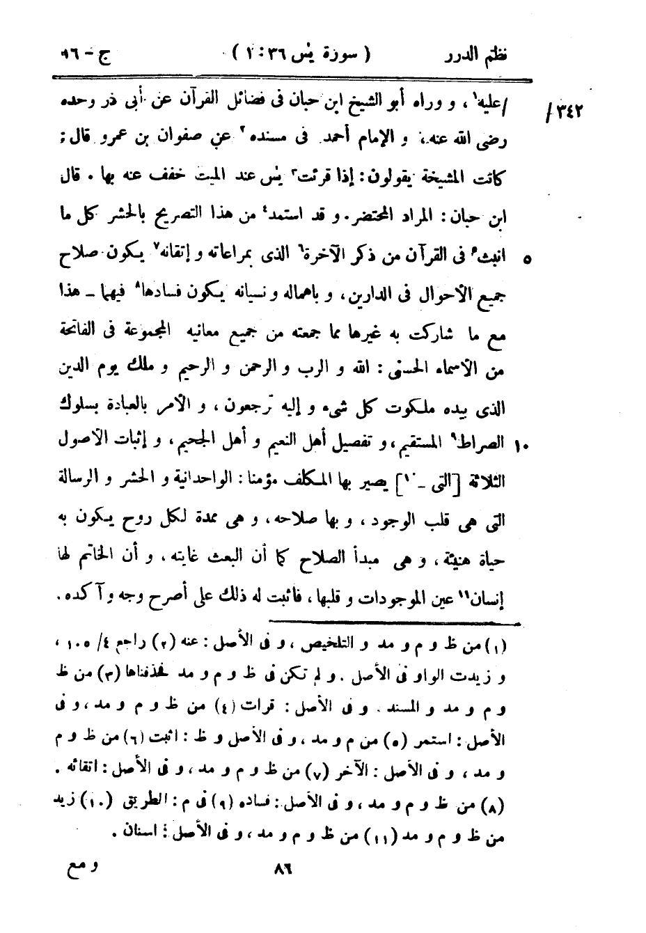 والإمام أحمد في مسنده عن صفوان بن عمرو قال: كانت المشيخة يقولون: إذا قرئت يس عند الميت خفف عنه بها. قال ابن حبان: المراد المحتضر. واستمد من هذا التصريح بالحشر كل ما انبث في القرآن من ذكر الآخرة الذي بمراعاته وإتقانه يكون صلاح جميع الأحوال في الدارين، وبإهماله ونسيانه يكون فسادها فيهما - هذا مع ما شاركت به غيرها مما جمعتهمن جميع معانيه المجموعة يفي الفاتحة من الأسماء الحسنى: الله والرب والرحمن والرحيم وملك يوم الدين الذي بيده ملكوت كل شيء وإليه ترجعون، والأمر بالعبادة بسلوك الصراط المستقيم، وتفضيل أهل النعيم وأهل الجحيم، وإثبات الأصول الثلاثة التي يصير بها المكلف مؤمنا: الوحدانية والحشر والرسالة التي هي قلب الوجود، وبها صلاحه، وهي ممدة لكل روح