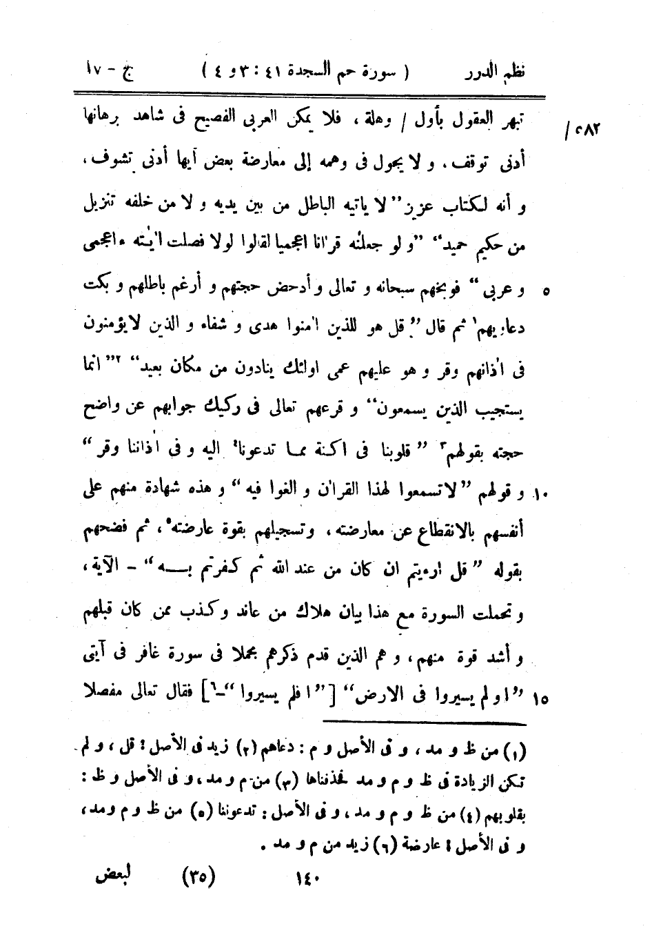 تبهر العقول بأول وهلة، فلا يمكن العربي الفصيح في شاهد برهان أدنى توقف، ولا يجول في وهمه إلى معارضة بعض آيها أدنى تشوف، وأنه لكتاب عزيز) لا يأتيه الباطل من بين يديه ولا من خلفه تنزيل من حكيم حميد () ولو جعلناه قرآناً أعجمياً لقالوا لولا فصلت آياته أعجمي وعربي (فوبخهم سبحانه وتعالى وأدحض حجتهم وأرغم باطلهم وبكَّت دعاويهم ثم قال) قل هو للذين آمنوا هدى وشفاء والذين لا يؤمنون في اذانهم وقر وهو عليهم عمى أولئك ينادون من مكان بعيد () إنما يستجيب الذين يسمعون (وقرعهم تعالى في ركيك جوابهم عن واضح حجته بقولهم) قلوبنا في أكنة مما تدعونا إليه وفي آذاننا وقر (وقولهم) لا تسمعوا لهذا القرآن والغوا فيه (وهذه شهادة منهم على أنفسهم بالانقطاع عن معارضته، وتسجيلهم بقوة عارضته، ثم فضحهم بقوله) قل أرأيتم إن كان من عند الله ثم كفرتم به (- الآية، وتحملت السورة مع هذا بيان هلاك من عاند وكذب ممن كان قبلهم وأشد قوة منهم، وهم الذين قدم ذكرهم مجملاً في سورة غافر في آيتي) أو لم يسيروا في الأرض () أفلم يسيروا (فقال تعالى مفصلاً