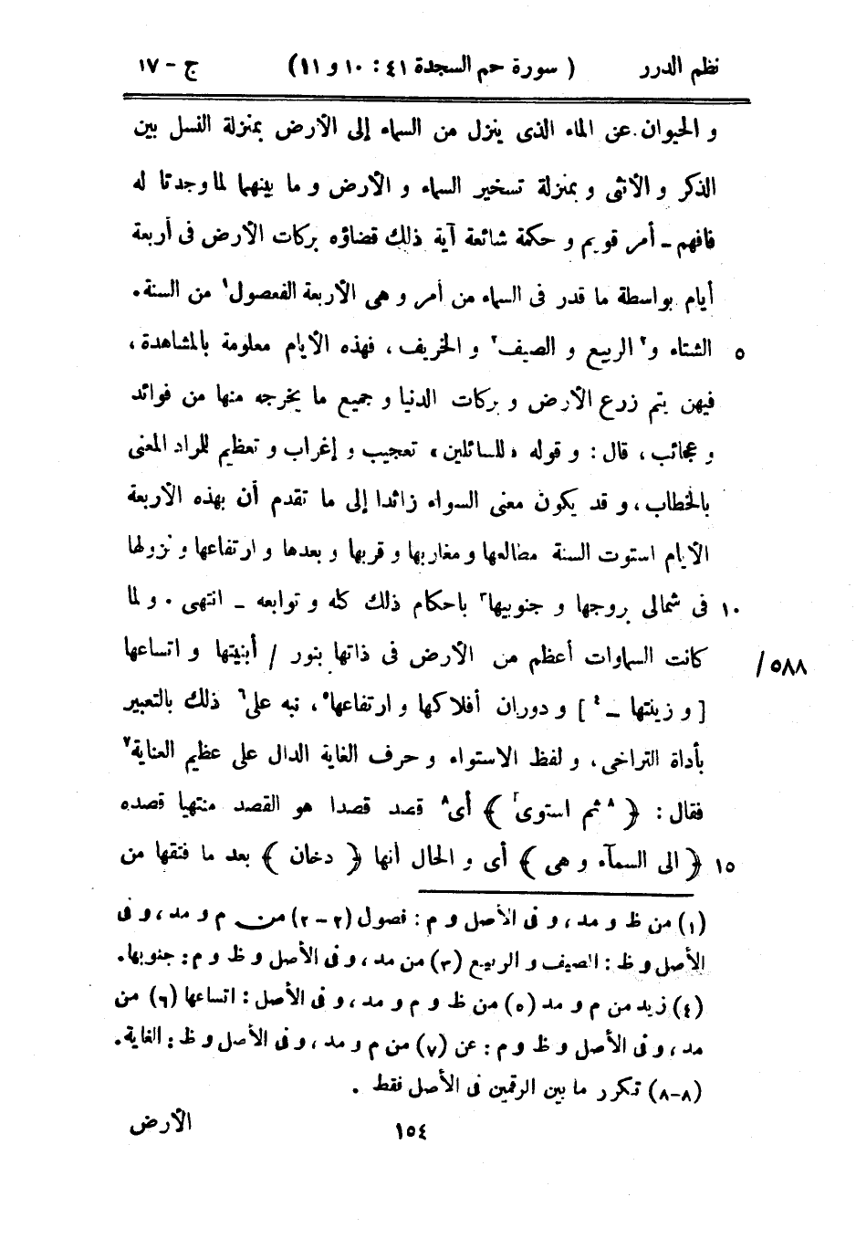 الشتاء الربيع الصيف والخريف، فهذه الأيام معلومة بالمشاهدة، فيهن يتم زرع الأرض وبركات الدنيا وجميع ما يخرجه منها من فؤائد وعجائب، قال: وقوله (السائلين) تعجيب وإغراب وتعظيم للمراد المعنى بالخطاب، وقد يكون معنى السواء زائداً إلى ما تقدم أن بهذه الأربعة الأيام استوت السنة مطالعها ومغاربها وقربها وبعدها وارتفاعها ونزولها في شمالي بروجها وجنوبيها باحكام ذلك كله وتوابعه - انتهى.