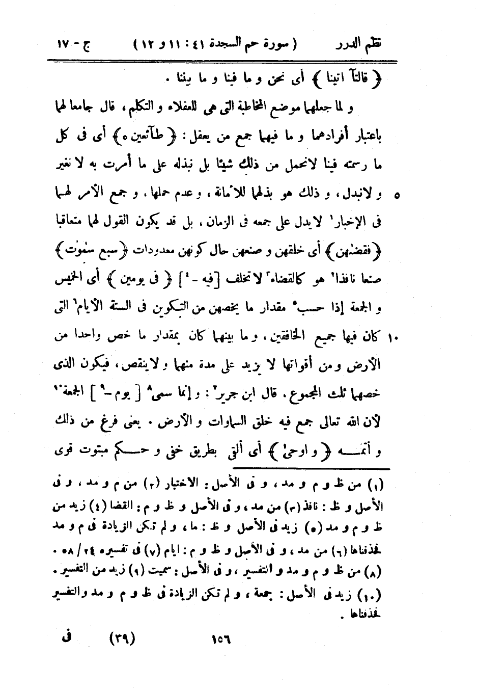 ولما جعلهما موضع المخاطبة للتي هي للعقلاء والتكلم، قال جامعاً لهما باعتبار أفرادهما وما فيهما جمع من يعقل: (طائعين) أي في كل ما رسمته فينا لا نحمل من ذلك شيئاً بل نبذله على ما أمرت به لا نغير ولا نبدل، وذلك هو بذلهما للأمانة، وعدم حملها، وجمع الأمر لهما في الإخبار لا يدل على جمعه في الزمان، بل قد يكون القول لهما متعاقباً) فقضاهن) أي خلقهن وصنعهن حال كونهن معدودات) سبع سماوات (صنعاً نافذاً هو كالقضاء لا تخلف فيه) في يومين) أي الخميس والجمعة إذا حسب مقدار ما يخصهن من التكوين في الستة الأيام التي كان فيها جحميع الخافقين، وما بينهما كان بمقدار ما خص واحداً من الأرض ومن أقواتها لا يزيد على مدة منهما ولا ينقص، فيكون الذي خصهما ثلث المجموع، قال ابن جرير: وإنما سمي يوم الجمعة لأن الله تعالى جمع فيه خلق السماوات والأرض.