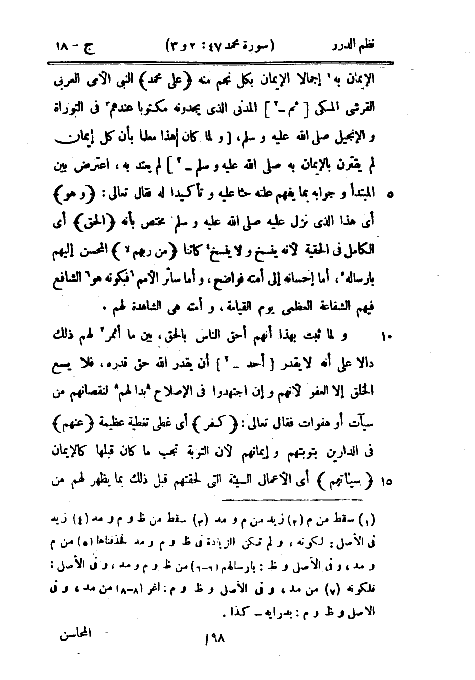وقال الإمام أبو جعفر بن الزبير: لما انبنت سورة الأحقاف على ما ذكر من مآل من كذب وافترى وكفر وفجر، وافتتحت السورة بإعراضهم، ختمت بما قد تكرر من تقريعهم وتوبيخهم، فقال تعالى: {ألم يروا أن الله الذي خلق السماوات والأرض ولم يعي بخلقهن بقادر على أن يحيي الموتى} أي لو اعتبروا بالبداءة لتيسر عليهم أمر العودة، ثم ذكر عرضهم على النار إلى قوله {فهل يهلك إلا القوم الفاسقون} فلما ختم بذكر هلاكهم، افتتح السورة الأخرى بعاجل ذلك اللاحق لهم في دنياهم فقال تعالى: {فإذا لقيتم الذين كفروا فضرب الرقاب حتى إذا أثخنتموهم فشدوا الوثاق فإما منّاً بعد وإما فداء حتى تضع الحرب أوزارها} الآية بعد ابتداء السورة بقوله {الذين كفروا وصدوا عن سبيل الله أضل أعمالهم} فنبه على أن أصل محنتهم إنما هو