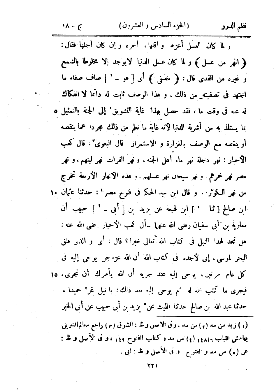 ولما كان التقدير: مثل بستان عظيم لا يسقط ورقه ولا ينقطع ثمره ولا يتفطن نعيمه لما فيه من الأنهار المتنوعة، وكان ما هو بهذه الصفة إنما هو موهوم لنا لا معلوم، طواه وذكره ما دل عليه من صفة الجنة الموعودة المعلومة بوعد الصادق الذي ثبت صدقه بالمعجزات فقال استئنافاً: {فيها} أي الجنة الموعودة. ولما كان ما يعهدونه من الجنان لا يحتمل أكثر من ثلاثة أنهار، عبر بالجمع الذي يستعار للكثرة إذا دلت قرينة، وهي هنا المدح والامتنان، فقال: {أنهار من ماء} ولما كان ماء الدنيا مختلف الطعوم على ثلاثة: حلو وعذب وملح، مع اتحاد الأرض ببساطتها وشدة اتصالها للدلالة على أن فاعل ذلك قادر مختار، وقد يكون آسناً أي متغيراً عن الماء الذي يشرب بريح منتنة من أصل خلقه أو من عارض عرض له من منبعه أو مجراه قال: {غير آسن} أي ثابت له في وقت ما شيء من الطعم أو الريح