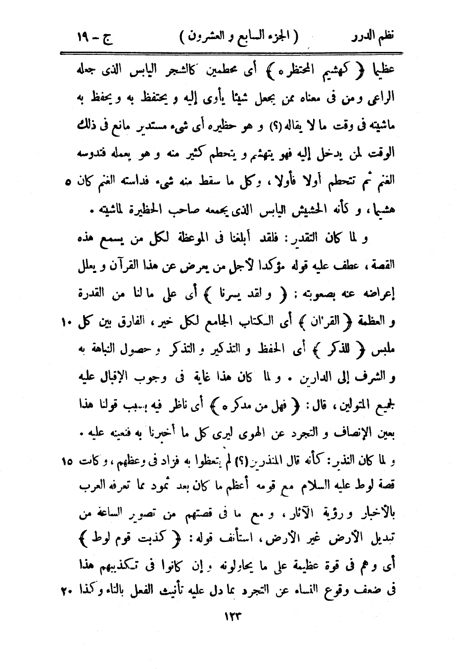 عظيماً {كهشيم المحتظر *} أي محطمين كالشجر اليابس الذي جعله الراعي ومن في معناه ممن يجعل شيئاً يأوي إليه ويحتفظ به ويحفظ به ماشيته في وقت ما لا يقاله (؟) وهو حظيره أي شيء مستدير مانع في ذلك الوقت لمن يدخل إليه فهو يتهشم ويتحطم كثير منه وهو يعمله فتدوسه الغنم ثم تتحطم أولاً فأولاً، وكل ما سقط منه شيء فداسته الغنم كان هشيماً، وكأنه الحشيش اليابس الذي يجمعه صاحب الحظيرة لماشيته.