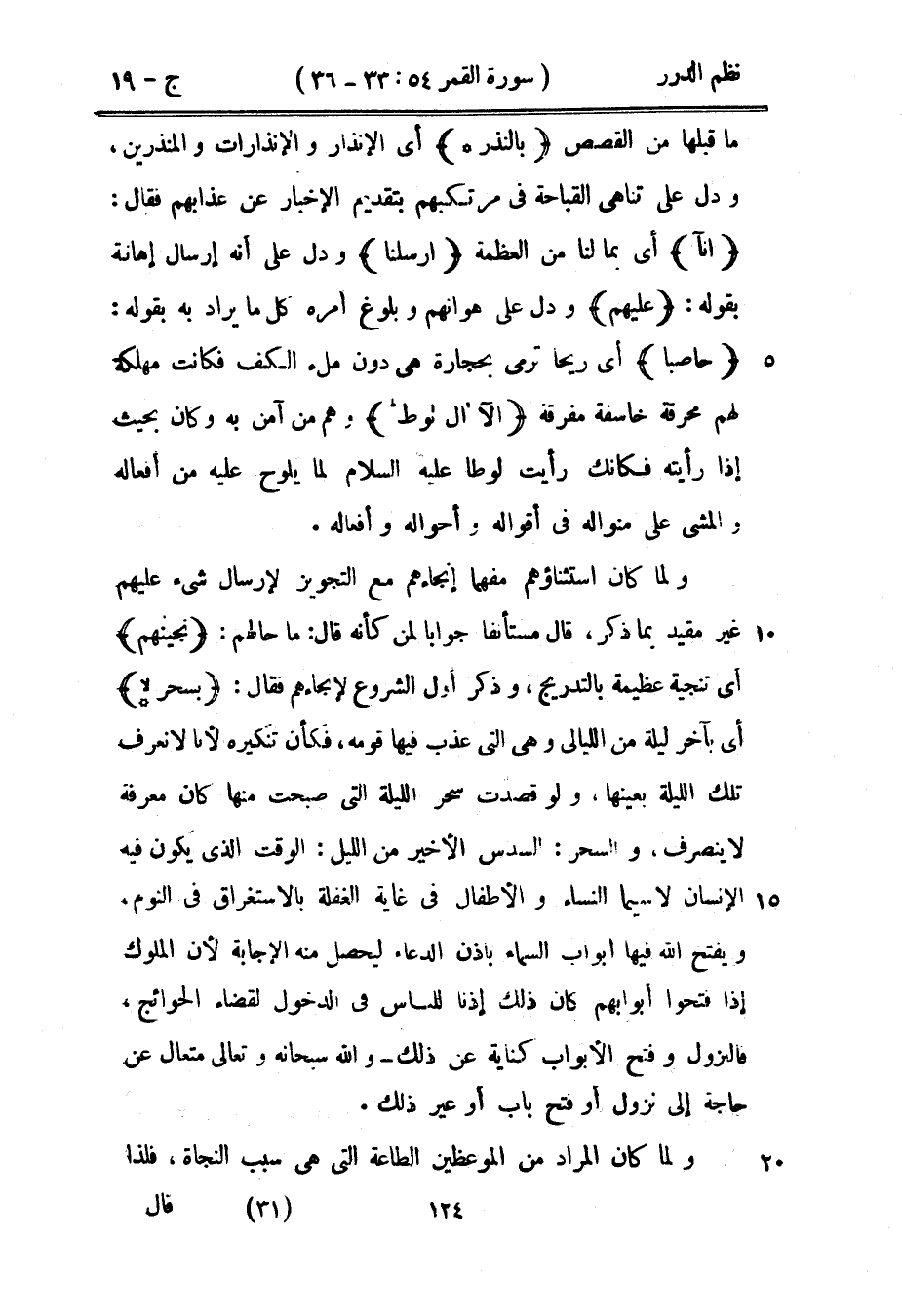 ولما كان استثناؤهم مفهماً إنجاءهم مع التجويز لإرسال شيء عليهم غير مقيد بما ذكر، قال مستأنفاً جواباً لمن كأنه قال: ما حالهم: {تجيناهم} أي تنجية عظيمة بالتدريج، وذكر أول الشروع لإنجاءهم فقال: {بسحر *} أي بآخر ليلة من الليالي وهي التي عذب فيها قومه، فكأنه تنكيره لأنا لا نعرف تلك الليلة بعينها، ولو قصدت سحر الليلة التي صبحت منها كان معرفة لا ينصرف، والسحر: السدس الأخير من الليل: الوقت الذي يكون فيه الإنسان لا سيما النساء والأطفال في غاية الغفلة بالاستغراق في النوم، ويفتح الله فيها أبواب السماء باذن الدعاء ليحصل منه الإجابة لأن الملوك إذا فتحوا أبوابهم كان ذلك إذناً للناس في الدخول لقضاء الحوائج، فالنزول وفتح الأبواب كناية عن ذلك - والله سبحانه وتعالى متعال عن حاجة إلى نزول أو فتح باب أو غير ذلك.