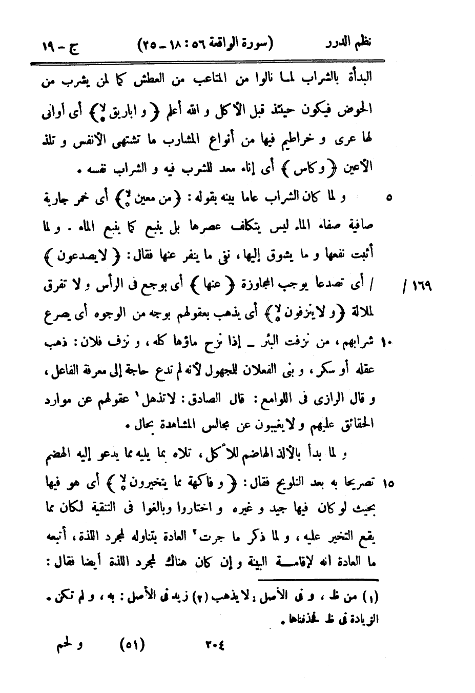 ولما كان الشراب عاماً بينه بقوله: {من معين *} أي خمر جارية صافية صفاء الماء ليس يتكلف عصرها بل ينبع كما ينبع الماء. ولما أثبت نفعها وما يشوق إليها، نفى ما ينفر عنها فقال: {لا يصدعون} أي تصدعاً يوجب المجاوزة {عنها} أي بوجع في الرأس ولا تفرق لملالة {ولا ينزفون *} أي يذهب بعقولهم بوجه من الوجوه أي يصرع شرابهم، من نزفت البئر - إذا نزح ماؤها كله، ونزف فلان: ذهب عقله أو سكر، وبنى الفعلان لملجهول لأنه لم تدع حاجة إلى معرفة الفاعل، وقال الرازي في اللوامع: قال الصادق: لا تذهل عقولهم عن موارد الحقائق عليهم ولا يغيبون عن مجالس المشاهدة بحال.