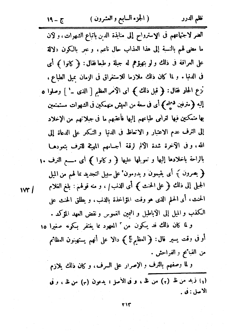 الضر لاجتماعهم في الاسترواح إلى منابذة الدين باتباع الشهوات، ولأن ما مضى لهم بالنسبة إلى هذا العذاب حال ناعم، وعبر بالكون دلالة على العراقة في ذلك ولو بتهيئهم له جبلة وطبعاً فقال: {كانوا} أي في الدنيا. ولما كان ذلك ملازماً للاستغراق في الزمان بميل الطباع، نزع الجار فقال: {قبل ذلك} أي الأمر العظيم الذي وصلوا إليه {مترفين *} أي في سعة من العيش منهمكين في الشهوات مستمتعين بها متمكنين فيها لترامي طباعهم إليها فأعقبهم ما في جبلاتهم من الإخلاد إلى الترف عدم الاعتبار والاتعاظ في الدنيا والتكبر على الدعاة إلى الله، وفي الآخرة شدة الألم لرقة أجسامهم المهيأة للترف بتعودها بالراحة بإخلادها إليها وتعويلها عليها {وكانوا} أي مع الترف {يصرون} أي يقيمون ويدومون على سبيل التجديد مما لهم من الميل الجبلي إلى ذلك {على الحنث} أي الذنب، ومنه قولهم: بلغ الغلام الحنث، أي الحلم الذي هو وقت المؤاخذة بالذنب، ويطلق الحنث على الكذب والميل إلى الأباطيل واليمين الغموس ونقض العهد المؤكد.