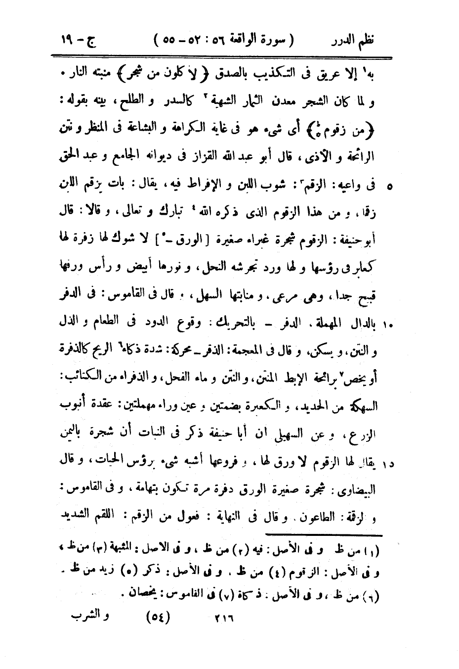 ولما كان الشجر معدن الثمار الشهية كالسدر والطلح، بينه بقوله: {من زقوم *} أي شيء هو في غاية الكراهة والبشاعة في المنظر ونتن الرائحة والأذى، قال أبو عبد الله القزاز في ديوانه الجامع وعبد الحق في واعيه: الزقم: شوب اللبن والإفراط فيه، يقال: بات يزقم اللبن زقماً، ومن هذا الزقوم الذي ذكره الله تبارك وتعالى، وقالا: قال أبو حنيفة: الزقوم شجرة غبراء صغيرة الورق لا شوك لها زفرة لها كعابر في رؤوسها ولها ورد تجرشه النحل، ونورها أبيض ورأس ورقها قبيح جداً، وهي مرعى، ومنابتها السهل، وقال في القاموس: في الدفر بالدال المهملة، الدفر - بالتحريك: وقوع الدود في الطعام والذل والنتن، ويسكن، وقال في المعجمة: الذفر - محركة: شدة ذكاء الريح كالذفرة أو يخص برائحة الإبط المنتن، والنتن وماء الفحل، والذفراء من الكتائب: السهكة من الحديد، والكعبرة بضمتين عين وراء مهملتين: عقدة أنبوب الزرع، وعن السهيلي أن أبا حنيفة ذكر في النبات أن شجرة باليمن يقال لها الزقوم لا ورق لها، وفروعها أشبه شيء برؤوس الحيات، وقال البيضاوي: شجرة صغيرة الورق دفرة مرة تكون بتهامة، وفي القاموس: والزقمة: الطاعون وقال في النهاية: فعول من الزقم: اللقم الشديد