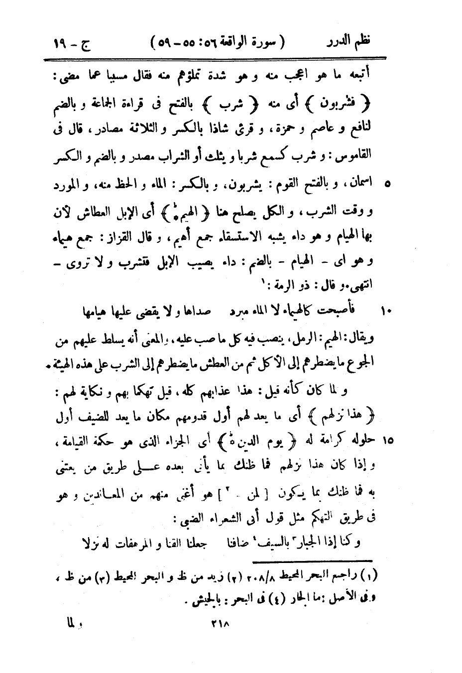 أتبعه ما هو أعجب منه وهو شدة تملئهم منه فقال مسبباً عما مضى: {فشاربون} أي منه {شرب} بالفتح في قراءة الجماعة وبالضم لنافع وعاصم وحمزة، وقرئ شاذاً بالكسر والثلاثة مصادر، قال في القاموس: وشرب كسمع شرباً ويثلث أوالشراب مصدر وبالضم والكسر اسمان، وبالفتح القوم: يشربون، وبالكسر: الماء والحظ منه، والمورد ووقت الشرب، والكل يصلح هنا {الهيم *} أي الإبل العطاش لأن بها الهيام وهو داء يشبه الاستسقاء جمع أهيم، وقال القزاز: جمع هيماء وهو أي - اليهام - بالضم: داء يصيب الإبل فتشرب ولا تروى - انتهى. وقال: ذو الرمة: