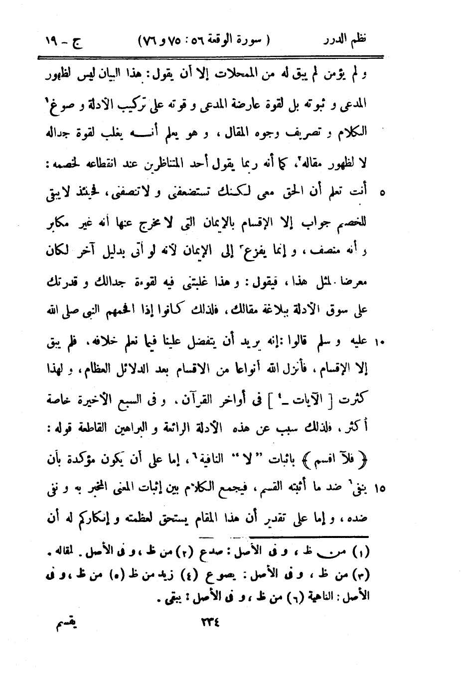 ولم يؤمن لم يبق له من الممحلات إلا أن يقول: هذا البيان ليس لظهور المدعى وثبوته بل لقوة عارضة المدعي وقوته على تركيب الأدلة وصوغ الكلام وتصريف وجوه المقال، وهو يعلم أنه يغلب لقوة جداله لا لظهور مقاله، كما أنه ربما يقول أحد المتناظرين عند انقطاعه لخصمه: أنت تعلم أن الحق معي لكنك تستضعفني ولا تنصفني، فحينئذ لا يبقى للخصم جواب إلا الإقسام بالإيمان التي لا مخرج عنها أنه غير مكابر وأنه منصف، وإنما يفزع إلى الإيمان لأنه لو أتى بدليل آخر لكان معرضاً لمثل هذا، فيقول: وهذا غلتني فيه لقوة جدالك وقدرتك على سوق الأدلة ببلاغة مقالك، فلذلك كانوا إذا أفحمهم النبي صَلَّى اللهُ عَلَيْهِ وَسَلَّمَ قالوا: إنه يريد أن يتفضل علينا فيما نعلم خلافه، فلم يبق إلا الإقسام، فأنزل الله أنواعاً من الأقسام بعد الدلائل العظام، ولهذا كثرت الآيات في أواخر القرآن، وفي السبع الأخيرة خاصة أكثر، فلذلك سبب عن هذه الأدلة الرائعة والبراهين القاطعة قوله: {فلا أقسم} بإثبات «لا» النافية، إما على أن يكون مؤكدة بأن ينفي ضد ما أثبته القسم، فيجمع الكلام بين إثبات المعنى المخبر به ونفي ضده، وإما على تقدير أن هذا المقام يستحق لعظمته وإنكارهم له أن