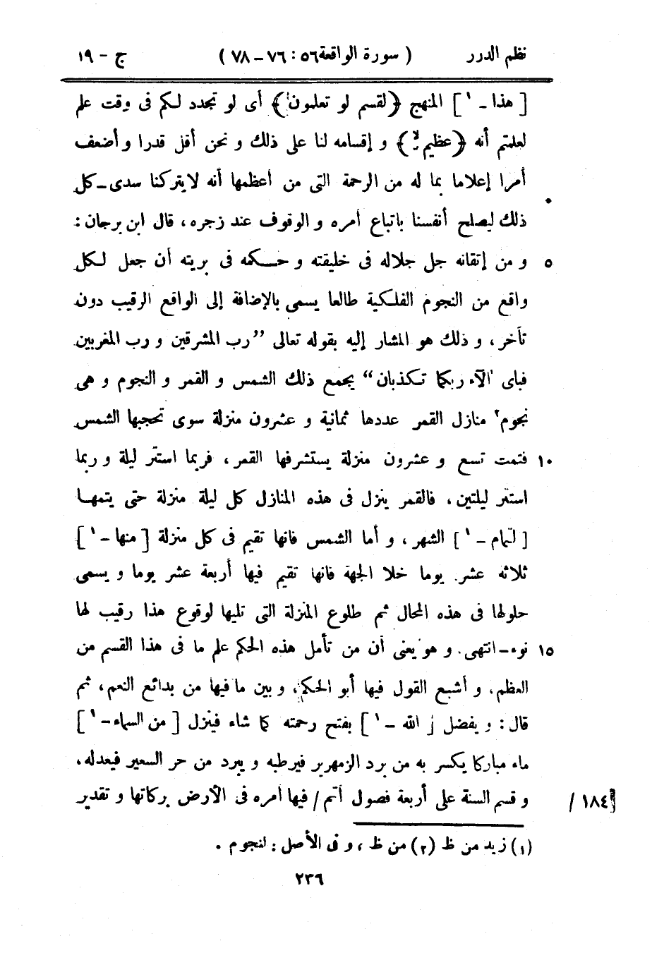 {رب المشرقين ورب المغربين فبأي آلاء ربكما تكذبان} [الرحمن: 18] يجمع ذلك الشمس والقمر والنجوم وهي نجوم منازل القمر عددها ثمانية وعشرون منزلة سوى تحجبها الشمس فتمت تسع وعشرون منزلة يشتشرفها القمر، فربما استتر ليلة وربما استتر ليلتين، فالقمر ينزل في هذه المنازل كل ليلة منزلة حتى يتمها لتمام الشهر، وإما الشمس فإنها تقيم فيها أربعة عشر يوماً ويسمى حلولها في هذه المحال ثم طلوع المنزلة التي تليها لوقوع هذا رقيب لها نوء - انتهى، وهو يعني أن من تأمل هذه الحكم علم ما في هذا القسم من العظم، وأشبع القول فيها أبو الحكم، وبين ما فيها من بدائع النعم، ثم قال: ويفضل الله بفتح رحمته كما يشاء فينزل من السماء ماء مباركاً يكسر به من برد الزمهرير فيرطبه ويبرد من حر السعير فيعدله، وقسم السنة على أربعة فصول أتم فيها أمره في الأرض بركاتها وتقدير