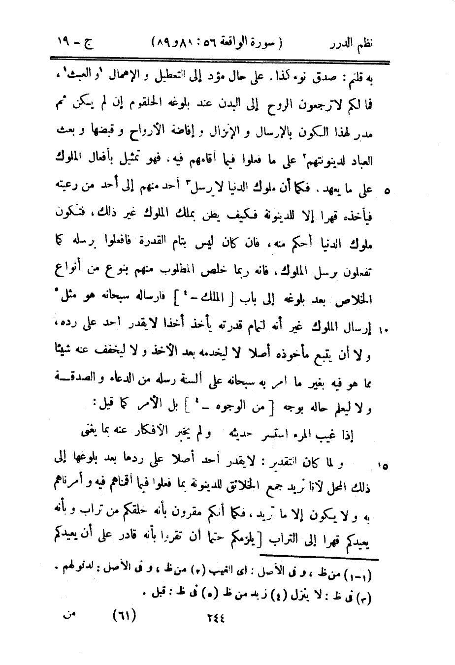 به قلتم: صدق نوء كذا، على حال مؤد إلى التعطيل والإهمال والعبث، فما لكم لا ترجعون الروح إلى البدن عند بلوغه الحلقوم إن لم يكن ثم مدبر لهذا الكون بالإرسال والإنزال وإفاضة الأرواح وقبضها وبعث العباد لدينونتهم على ما فعلوا فيما أقامهم فيه، تمثيل بأفعال الملوك على ما يعهد، فكما أن ملوك الدنيا لا يرسل أحد منهم إلى أحد من رعيته فيأخذه قهراً إلا للدينونة فكيف يظن بملك الملوك غير ذلك، فتكون ملوك الدنيا أحكم منه، فإن كان ليس بتمام القدرة فافعلوا برسله كما تفعلون برسل الملوك، فإنه ربما خلص المطلوب منهم بنوع من أنواع الخلاص بعد بلوغه إلى باب الملك فإرساله سبحانه هو مثل إرسال الملوك غير أنه لتمام قدرته يأخذ أخذاً لا يقدر أحد على رده، ولا أن يتبع مأخوذه أصلاً لا ليخدمه بعد الأخذ ولا ليخفف عنه شيئاً مما هو فيه بغير ما أمر به سبحانه على ألسنة رسله من الدعاء والصدقة ولا ليعلم حاله بوجه من الوجوه بل الأمر كما قيل: