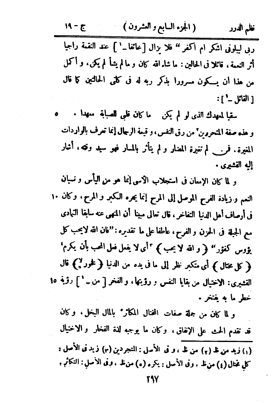 ربي ليبلوني أشكر أم أكفر} [النمل: 40] فلا يزال خائفاً عند النقمة راجياً أثر النعمة، قائلاً في الحالين: ما شاء الله كان وما لم يشأ لم يكن، وأكمل من هذا أن يكون مسروراً بذكر ربه له في كلتا الحالتين كما قال القائل: