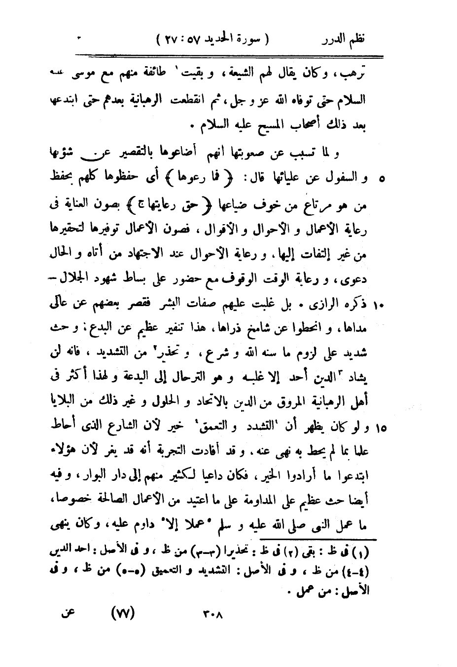 ولما تسبب عن صعوبتها أنهم أضاعوها بالتقصير عن شؤونها والسفول عن عليائها قال: {فما رعوها} أي حفظوها كلهم بحفظ من هو مرتاع من خوف ضياعها {حق رعايتها} بصون العناية في رعاية الأعمال والأحوال والأقوال، فصون الأعمال توفيرها لتحقيرها من غير التفات إليها، ورعاية الأحوال عند الاجتهاد من أتاه والحال دعوى، ورعاية الوقت الوقوف مع حضور على بساط شهود الجلال - ذكره الرازي. بل غلبت عليهم صفات البشر فقصر بعضهم عن عالي مداها، وانحطوا عن شامخ ذراها، هذا تنفير عظيم عن البدع، وحث شديد على لزوم ما سنه الله وشرع، وتحذير من التشديد، فإنه لن يشادّ الدين أحد إلا غلبه وهو الترحال إلى البدعة ولهذا أكثر في أهل الرهبانية المروق من الدين بالاتحاد والحلول وغير ذلك من البلايا ولو كان يظهر أن التشديد والتعمق خير لأن الشارع الذي أحاط علماً بما لم يحط به نهى عنه، وقد أفادت التجربة أنه قد يغر لأن هؤلاء ابتدعوا ما أرادوا الخير، فكان داعياً لكثير منهم إلى دار البوار، وفيه أيضاً حث عظيم على المداومة على ما اعتيد من الأعمال الصالحة خصوصاً، ما عمل النبي صَلَّى اللهُ عَلَيْهِ وَسَلَّمَ عملاً إلا دوام عليه، وكان ينهى