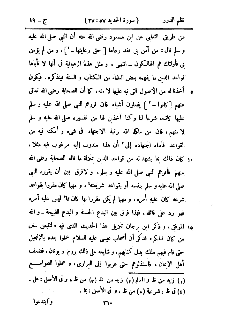 من طريق الثعلبي عن ابن مسعود رضي الله عنه أن النبي صَلَّى اللهُ عَلَيْهِ وَسَلَّمَ قال: «من آمن بي فقد رعاها حق رعايتها، ومن لم يؤمن بي فأولئك هم الهالكون» انتهى. ومثل هذه الرهبانية في أنها لا تأباها قواعد الدين ما يفهمه بعض العلماء من الكتاب والسنة فيتذكره، فيكون أخذنا له من الأصول التي نبه عليها لا منه، كما أن الصحابة رضي الله تعالى عنهم كانوا يفعلون أشياء فإن قررهم النبي صَلَّى اللهُ عَلَيْهِ وَسَلَّمَ كانت شرعاً لنا وكنا آخذين لها من تفسيره صَلَّى اللهُ عَلَيْهِ وَسَلَّمَ لا منهم، فإن من ملكه الله رتبة الاجتهاد في شيء وأمكنه فيه من القواعد فأداه اجتهاده إلى أن هذا مندوب إليه مرغوب فيه مثلاً، كان ذلك بما يشهد له من قواعد الدين بمنزلة ما قاله الصحابة رضي الله عنهم فأقرهم النبي صَلَّى اللهُ عَلَيْهِ وَسَلَّمَ، ولا فرق بين أن يقرره النبي صَلَّى اللهُ عَلَيْهِ وَسَلَّمَ بنفسه أو بقواعد شريعته، ومهما كان مقرراً بقواعد شرعه كان عليه أمره، ومهما لم يكن مقرراً بها كان مما ليس عليه أمره فهو رد على قائله، فهذا فرق بين البدع الحسنة والبدع القبيحة - والله الموفق، وذكر ابن برجان تنزيل هذا الحديث الذي فيه «لتتبعن سنن من كان قبلكم» فذكر أن أصحاب عيسى عليه السلام عملوا بعده بالإنجيل حتى قام فيهم ملك بدل كتابهم، وشايعه على ذلك روم ويونان، فضعف أهل الإيمان، فاستذلوهم حتى هربوا إلى البراري، وعملوا الصوامع