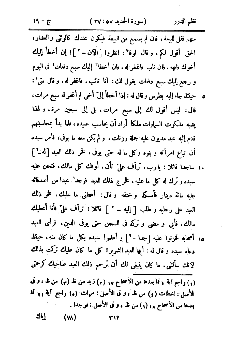 منهم فقل للبيعة، فإن لم يسمع من البيعة فيكون عندك كالوثني والعشار، الحق أقول لكم، وقال لوقا: انظروا الآن إن أخطأ إليك أخوك فانهه، فإن تاب فاغفر له، فإن أخطأ إليك سبع دفعات في اليوم ورجع إليك سبع دفعات يقول لك: أنا تائب، فاغفر له، وقال متى: حينئذ جاء إليه بطرس وقال له: إذا أخطأ إليّ أخي لم أغفر له سبع مرات، قال: ليس أقول لك إلى سبع مرات، بل إلى سبعين مرة، ولهذا يشبه ملكوت السماوات ملكاً أراد أن يحاسب عبيده، فلما بدأ بمحاسبتهم قدم إليه عبد مديون عليه جملة وزنات، ولم يكن معه ما يوفي، فأمر سيده أن تباع امرأته وبنوه وكل ما له حتى يوفي، فخر ذلك العبد له ساجداً قائلاً: يا رب، ترأف عليّ تأن، أوفك كل مالك، فتحنن عليه سيده وترك له كل ما عليه، فخرج ذلك العبد فوجد عبداً من أصدقائه عليه مائة دينار فأمسكه وخنقه وقال: أعطني ما عليك، فخر ذلك العبد على رجليه وطلب إليه قائلاً: ترأف عليّ فأنا أعطيك مالك، فأبى ومضى ورتكه في السجن حتى يوفي الدين، فرأى العبد أصحابه فحزنوا عليه جداً وأعلموا سيده بكل ما كان منه، حينئذ دعاه سيده وقال له: أيها العبد الشرير! كل ما كان عليك تركت بذلك لأنك سألتني، ما كان ينبغي لك أن ترحكم ذلك العبد صاحبك كرحمتي