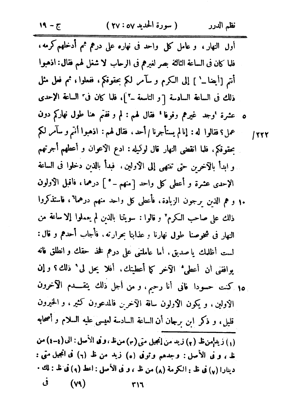 أول النهار، وعامل كل واحد في نهاره على درهم ثم أدخلهم كرمه، فلما كان في الساعة الثالثة بصر لغيرهم في الرحاب لا شغل لهم فقال: اذهبوا أنتم أيضاً إلى الكرم وسآمر لكم بحقوقكم، ففعلوا، ثم فعل مثل ذلك في الساعة السادسة والتاسعة، فلما كان في الساعة الإحدى عشرة وجد غيرهم وقوفاً فقال لهم: لم وقفتم هنا طول نهاركم دون عمل؟ فقالوا له: إنا لم يستأجرنا أحد، فقال لهم: اذهبوا أنتم سآمر لكم بحقوقكم، فلما انقضى النهار قال لوكيله: ادع الأعوان وأعطهم أجرتهم وابدأ بالآخرين حتى تنتهي إلى الأولين، فبدأ بالذين دخلوا في الساعة الإحدى عشرة وأعطى كل واحد منهم درهماً، قأقبل الأولون وهم الذين يرجون الزيادة، فأعطى كل واحدٍ منهم درهماً، فاستذكروا ذلك على صاحب الكرم وقالوا: سويتنا بالذين لم يعملوا إلا ساعة من النهار في شخوصنا طول نهارنا وعذابنا بحرارته، فأجاب أحدهم وقال: لست أظلمك يا صديق، أما عاملتني على درهم فخذ حقك وانطلق فإنه يوافقني أن أعطي الآخر كما أعطيتك، أفلا يحل لي ذلك؟ وإن كنت حسوداً فإني أنا رحيم، ومن أجل ذلك يتقدم الآخرون الأولين، ويكون الأولون ساقة الآخرين فالمدعوون كثير، والخيرون قليل، وذكر ابن برجان أن الساعة السادسة لعيسى عليه السلام وأصحابه
