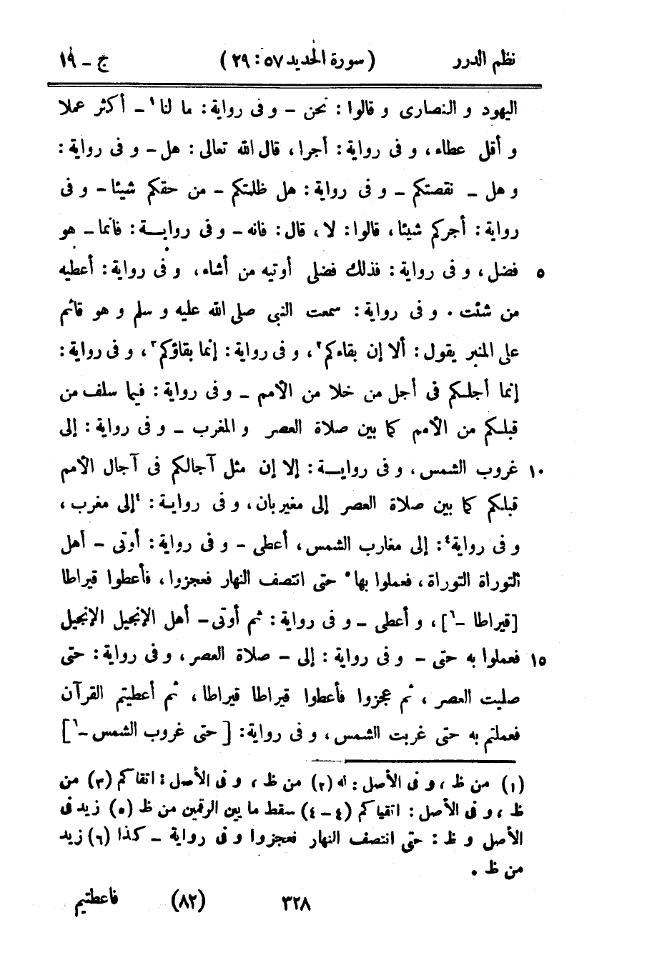 اليهود والنصارى» وقالوا: «نحن» - وفي رواية: «ما لنا - أكثر عملاً وأقل عطاء» ، وفي رواية «أجراً، قال الله تعالى هل» - وفي رواية: «وهل - نقصتكم -» وفي رواية: «هل ظلمتكم - من حقكم شيئاً -» وفي رواية: «أجركم شيئاً، قالوا: لا، قال: فإنه» - وفي رواية: «فإنما - هو فضل» ، وفي رواية: «فذلك فضلي أوتيه من أشاء» ، وفي رواية: «أعطيه من شئت» وفي رواية: سمعت النبي صَلَّى اللهُ عَلَيْهِ وَسَلَّمَ وهو قائم على المنبر يقول: «ألا إن بقاءكم» ، وفي رواية: «إنما بقاؤكم» ، وفي رواية: «إنما أجلكم في أجل من خلا من الأمم» - وفي رواية: «فيما سلف من قبلكم من الأمم كما بين صلاة العصر والمغرب» - وفي رواية: «إلى غروب الشمس» ، وفي رواية: «ألا إن مثل آجالكم في آجال الأمم قبلكم كما بين صلاة العصر إلى مغيربان» ، وفي رواية: «إلى مغرب» ، وفي رواية: «إلى مغارب الشمس، أعطي» - وفي رواية: «أوتي - أهل التوراة التوراة، فعملوا بها حتى انتصف النهار فعجزوا، فأعطوا قيراطاً قيراطاً، وأعطي» - وفي رواية: «ثم أوتي - أهل الإنجيل الإنجيل فعملوا به حتى» - وفي رواية: «إلى - صلاة العصر» ، وفي رواية «حتى صليت العصر، ثم عجزوا فأعطوا قيراطاً قيراطاً، ثم أعطيتم القرآن فعملتم به حتى غربت الشمس» ، وفي رواية: «حتى غروب الشمس