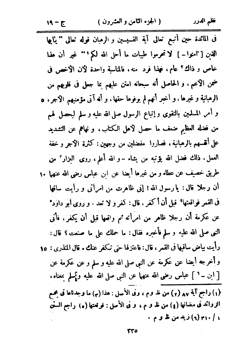 في المائدة حين أتبع تعالى آية القسيسين والرهبان قوله تعالى {يأيها الذين آمنوا لا تحرموا طيبات ما أحل الله لكم} [المائدة: 87] غير أن هذا خاص وذاك عام، فهذا فرد منه، فالمناسبة واحدة لأن الأخص في ضمن الأعم، والحاصل أنه سبحانه امتنَّ عليهم بما جعل في قلوبهم من الرهبانية وغيرها، وأخبر أنهم لم يوفوها حقها، وأنه آتى مؤمنيهم الأجر، وأمر المسلمين بالتقوى واتباع الرسول صَلَّى اللهُ عَلَيْهِ وَسَلَّمَ ليحصل لهم من فضله العظيم ضعف ما حصل لأهل الكتاب، ونهاهم عن التشديد على أنفسهم بالرهبانية، فصاروا مفضلين من وجهين: كثرة الأجر وخفة العمل، ذلك فضل الله يؤتيه من يشاء - والله أعلم، روى البزار من طريق خصيف عن عطاء من غيرهما أيضاً عن ابن عباس رضي الله عنهما أن رجلاً قال: يا رسول الله! إني ظاهرت من امرأتي ورأيت ساقها في القمر فواقعتها قبل أن أكفر، قال «كفِّر ولا تعد» وروى أبو داود عن عكرمة أن رجلاً ظاهر من امرأته ثم واقعها قبل أن يكفر، فأتى النبي صَلَّى اللهُ عَلَيْهِ وَسَلَّمَ فأخبره فقال: «ما حملك على ما صنعت؟ قال: رأيت بياض ساقيها في القمر، قال: فاعتزلها حتى تكفر عنك» قال المنذري: وأخرجه أيضاً عن عكرمة عن النبي صَلَّى اللهُ عَلَيْهِ وَسَلَّمَ وعن عكرمة عن ابن عباس رضي الله عنهما عن النبي صَلَّى اللهُ عَلَيْهِ وَسَلَّمَ بمعناه،