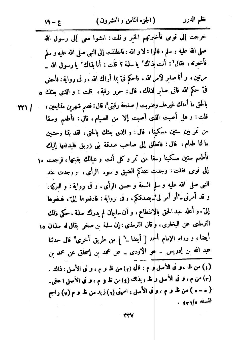 خرجت إلى قومي فأخبرتهم الخبر وقلت: امشوا معي إلى رسول الله صَلَّى اللهُ عَلَيْهِ وَسَلَّمَ، قالوا: لا والله: فانطلقت إلى النبي صَلَّى اللهُ عَلَيْهِ وَسَلَّمَ فأخبرته، فقال» أنت بذاك يا سلمة؟ قلت: أنا بذاك يا رسول الله مرتين، وأنا صابر لأمر الله، فاحكم فيّ بما أراك الله، وفي رواية: فأمض فيَّ حكم الله فإني صابر لذلك، قال حرر رقبة. قلت: والذي بعثك بالحق ما أملك غيرها - وضربت صفحة رقبتي، قال: فصم شهرين متتابعين، قلت: وهل أصبت الذي أصبت إلا من الصيام، قال: فاطعم وسقاً من تمر بين ستين مسكيناً، قال: والذي بعثك بالحق، لقد بتنا وحشين ما لنا طعام، قال: فانطلق إلى صاحب صدقة بني زريق فليدفعها إليك فأطعم ستين مسكيناً وسقاً من تمر وكل أنت وعيالك بقيتها «فرجعت إلى قومي فقلت: وجدت عندكم الضيق وسوء الرأي، ووجدت عند النبي صَلَّى اللهُ عَلَيْهِ وَسَلَّمَ السعة وحسن الرأي، وفي رواية: والبركة وقد أمرني - أو أمر لي - بصدقتكم، وفي رواية: فادفعوها إليّ، فدفعوها إليّ) . وأعله عبد الحق بالانقطاع، وأن سليمان لم يدرك سلمة، حكى ذلك الترمذي عن البخاري، وقال الترمذي: إن سلمة بن صخر يقال له سلمان أيضاً، ورواه الإمام أحمد أيضاً من طريق أخرى قال» حدثنا عبد الله بن إدريس - هو الأودي - عن محمد بن إسحاق عن محمد بن