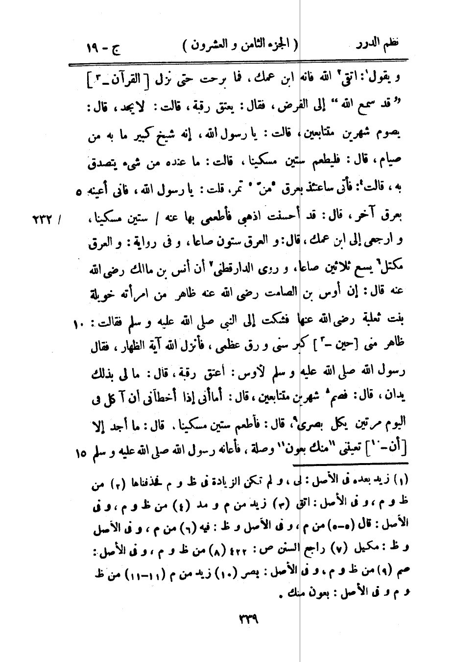 ويقول: اتقي الله فإنه ابن عمك، فما برحت حتى نزل القرآن {قد سمع الله} إلى الفرض، فقال: يعتق رقبة، قالت: لا يجد، قال: يصوم شهرين متتابعين، قالت: يا رسول الله، إنه شيخ كبير ما به من صيام، قال فليطعم ستين مسكيناً، قالت: ما عنده من شيء يتصدق به قالت: فأتي ساعتئذ بعرق منّ تمر، قلت: يا رسول الله، فإني أعينه بعرق آخر، قال: قد أحسنت أذهبي فأطعمي بها عنه ستين مسكيناً، وارجعي إلى ابن عمك «قال: والعرق ستون صاعاً، وفي رواية: والعرق مكتل يسع ثلاثين صاعاً،» وروى الدارقطني أن أنس بن مالك رضي الله عنه قال: «إن أوس بن الصامت رضي الله عنه ظاهر من امرأته خويلة بنت ثعلبة رضي الله عنها فشكت إلى النبي صَلَّى اللهُ عَلَيْهِ وَسَلَّمَ فقالت: ظاهر مني حين كبر سني ورق عظمي، فأنزل الله آية الظهار، فقال رسول الله صَلَّى اللهُ عَلَيْهِ وَسَلَّمَ لأوس اعتق رقبة، قال: مالي بذلك يدان، قال: فصم شهرين متتابعين، قال: أما إني إذا أخطأني أن آكل في اليوم مرتين يكل بصري، قال فأطعم ستين مسكيناً» ، قال: ما أجد إلا أن تعينني منك بعون وصلة، فأعانه رسول الله صَلَّى اللهُ عَلَيْهِ وَسَلَّمَ