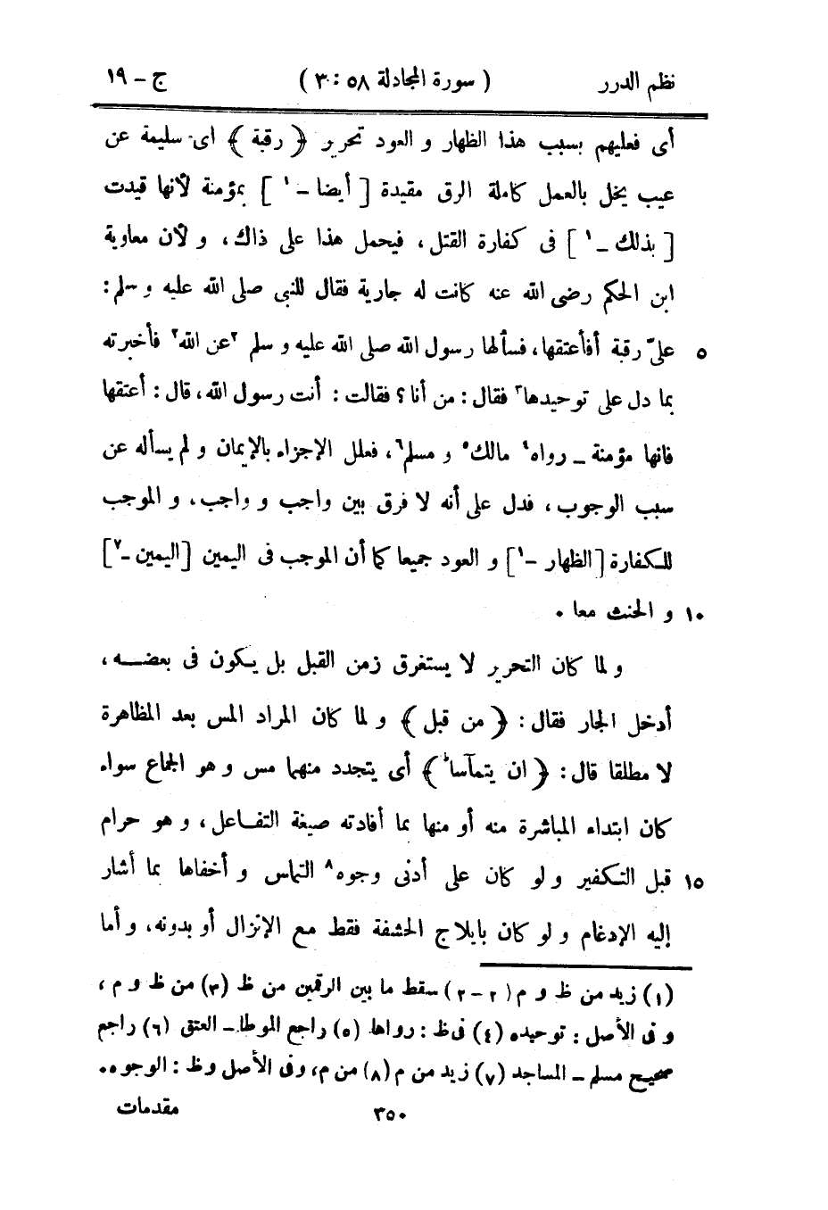 أي فعليهم بسبب هذا الظهار والعود تحرير {رقبة} أي سليمة عن عيب يخل بالعمل كاملة الرق مقيدة أيضاً بمؤمنة لأنها قيدت بذلك في كفارة القتل، فيحمل هذا على ذاك، ولأن معاوية بن الحكم رضي الله عنه كانت له جارية فقال للنّبيّ صَلَّى اللهُ عَلَيْهِ وَسَلَّمَ: «عليّ رقبة أفأعتقها، فسألها رسول الله صَلَّى اللهُ عَلَيْهِ وَسَلَّمَ عن الله فأخبرته بما دل على توحيدها فقال: من أنا؟ فقالت: أنت رسول الله، قال: أعتقها فإنها مؤمنة» رواه مالك ومسلم، فعلل الإجزاء بالإيمان ولم يسأله عن سبب الوجوب، فدل على أنه لا فرق بين واجب وواجب، والموجب للكفارة الظهار والعود جميعاً كما أن الموجب في اليمين اليمين والحنث معاً.
