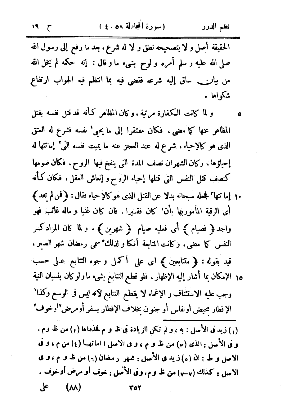 ولما كانت الكفارة مرتبة، وكان المظاهر كأنه قد قتل نفسه بقتل المظاهر عنها كما مضى، فكان مفتقراً إلى ما يحيي نفسه فشرع له العتق الذي هو كالإحياء، شرع له عند العجز عنه ما يميت نفسه التي إماتتها له إحياؤها، وكان الشهران نصف المدة التي ينفخ فيها الروح، فكان صومها كنصف قتل النفس التي قتلها إحياء الروح وإنعاش العقل، فكان كأنه إماتتها فجعله سبحانه بدلاً عن القتل الذي هو كالإحياء فقال: {فمن لم يجد} أي الرقبة المأمور بها بأن كان فقيراً، فإن كان غنياً وماله غائب فهو واجد {فصيام} أي فعليه صيام {شهرين} . ولما كان المراد كسر النفس كما مضى، وكانت المتابعة أنكى ولذلك سمي رمضان شهر الصبر، قيد بقوله: {متتابعين} أي على أكمل وجوه التتابع على حسب الإمكان بما أشار إليه الإظهار، فلو قطع التتابع بشيء ما ولو كان بنسيان النية وجب عليه الاستئناف والإغماء لا يقطع التتابع لأنه ليس في الوسع وكذا الإفطار بحيض أو نفاس أو جنون بخلاف الإفطار بسفر أو مرض أو خوف