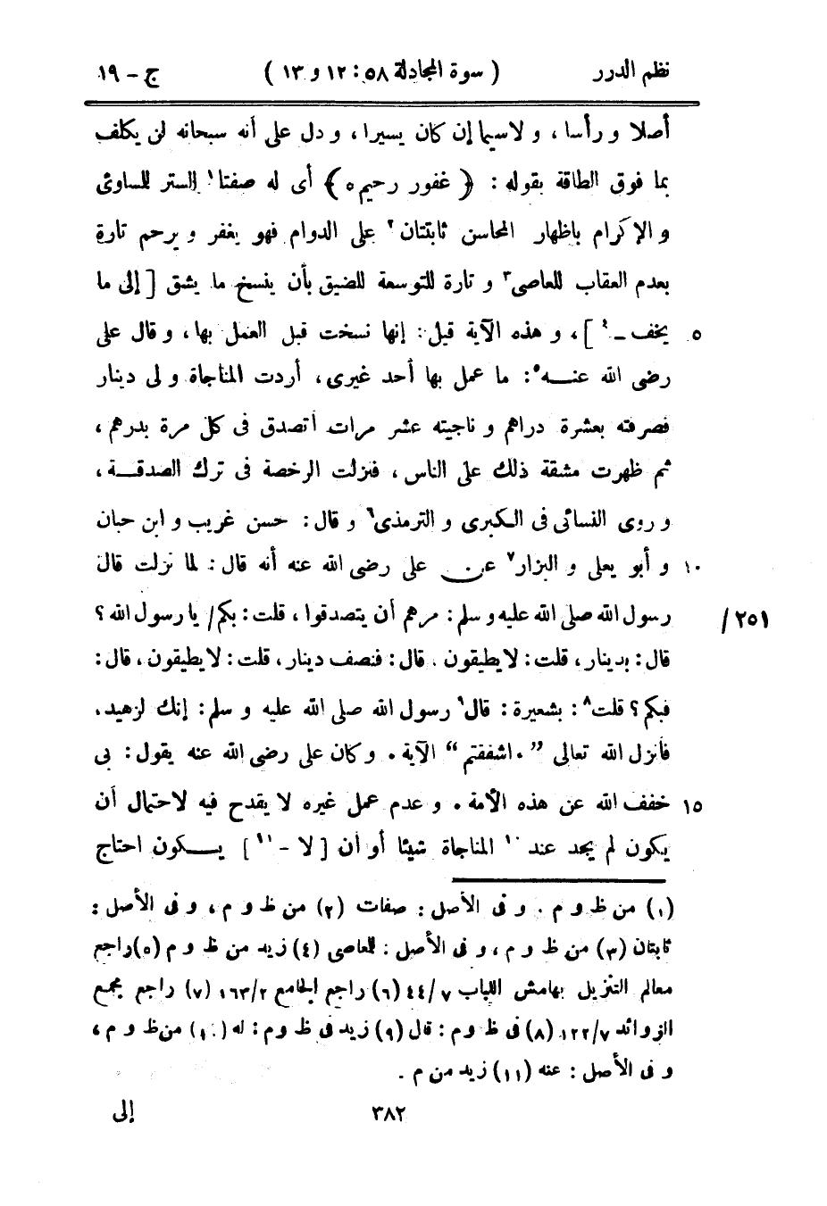 أصلاً ورأساً، ولا سيما إن كان يسيراً، ودل على أنه سبحانه لن يكلف بما فوق الطاقة بقوله: {غفور رحيم *} أي له صفتا الستر للمساوئ والإكرام بإظهار المحاسن ثابتتان على الدوام فهو يغفر ويرحم تارة بعدم العقاب للعاصي وتارة للتوسعة للضيق بأن ينسخ ما يشق إلى ما يخف، وهذه الآية قيل: إنها نسخت قبل العمل بها، وقال علي رضي الله عنه: ما عمل بها أحد غيري، أردت المناجاة ولي دينار فصرفته بعشرة دراهم وناجيته عشر مرات أتصدق في كل مرة بدرهم، ثم ظهرت فشق ذلك على الناس، فنزلت الرخصة في ترك الصدقة، «وروى النسائي في الكبرى والترمذي وقال: حسن غريب وابن حبان وأبو يعلى والبزار عن علي رضي الله عنه أنه قال: لما نزلت قال رسول الله صَلَّى اللهُ عَلَيْهِ وَسَلَّمَ:» مرهم أن يتصدقوا «. قلت: بكم يا رسول الله؟ قال:» بدينار «، قلت: لا يطيقون. قال:» فنصف دينار «، قلت: لا يطيقون، قال:» فبكم؟ «قلت: بشعيرة: قال رسول الله صَلَّى اللهُ عَلَيْهِ وَسَلَّمَ:» إنك لزهيد «، فأنزل الله تعالى {أأشفقتم} الآية. وكان علي رضي الله عنه يقول: بي خفف الله عن هذه الأمة. وعدم عمل غيره لا يقدح فيه لاحتمال أن يكون لم يجد عند المناجاة شيئاً أو أن لا يكون احتاج إلى