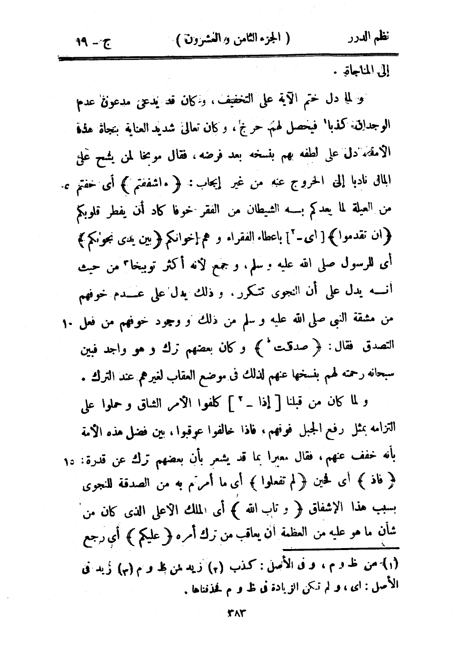 ولما كان من قبلنا إذا كلفوا الأمر الشاق وحملوا على التزامه بمثل رفع الجبل فوقهم، فإذا خالفوا عوقبوا، بين فضل هذه الأمة بأنه خفف عنهم، فقال معبراً بما قد يعشر بأن بعضهم ترك عن قدرة: {فإذ} أي فحين {لم تفعلوا} أي ما أمرتم به من الصدقة للنجوى بسبب هذا الإشفاق {وتاب الله} أي الملك الأعلى الذي كان من شأن ما هو عليه من العظمة أن يعاقب من ترك أمره {عليكم} أي رجع