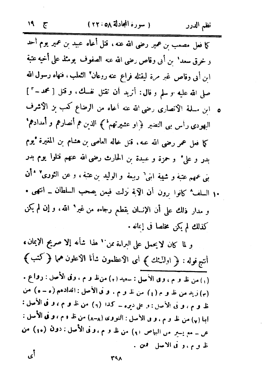كما فعل مصعب بن عمير رضي الله عنه، قتل أخاه عبيد بن عمير يوم أحد وخرق سعد بن أبي وقاص رضي الله عنه الصفوف يومئذ على أخيه عتبة بن أبي وقاص غير مرة ليقتله فراع عنه روعان الثعلب، فنهاه رسول الله صَلَّى اللهُ عَلَيْهِ وَسَلَّمَ وقال: أتريد أن تقتل نفسك وقتل محمد بن مسلمة الأنصاري رضي الله عنه أخاه من الرضاع كعب بن الأشرف اليهودي رأس بني النضير {أو عشيرتهم} الذين هم أنصارهم وأمدادهم كما فعل عمر رضي الله عنه، قتل خاله العاصي بن هشام بن المغيرة يوم بدر وعلي وحمزة وعبيدة بن الحارث رضي الله عنهم قتلوا يوم بدر بني عمهم عتبة وشيبة ابني ربيعة والوليد بن عتبة، وعن الثوري أن السلف كانوا يرون أن الآية نزلت فيمن يصحب السلطان - انتهى. ومدار ذلك على أن الإنسان يقطع رجاءه من غير الله، وإن لم يكن كذلك لم يكن مخلصاً في إيمانه.
