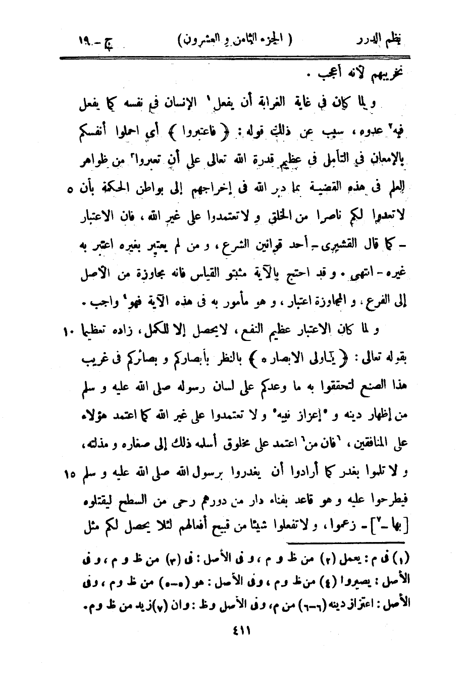 ولما كان الاعتبار عظيم النفع، لا يحصل إلا للكمل، زاده تعظيماً بقوله تعالى: {يا أولي الأبصار *} بالنظر بأبصاركم وبصائركم في غريب هذا الصنع لتحققوا به ما وعدكم على لسان رسوله صَلَّى اللهُ عَلَيْهِ وَسَلَّمَ من إظهار دينه وإعزاز نبيه ولا تعتمدوا على غير الله كما اعتمد هؤلاء على المنافقين، فإن من اعتمد على مخلوق أسلمه ذلك إلى صغاره ومذلته، ولا تلموا بغدر كما أرادوا أن يغدروا برسول الله صَلَّى اللهُ عَلَيْهِ وَسَلَّمَ فيطرحوا عليه وهو قاعد بفناء دار من دورهم رحى من السطح ليقتلوه بها - زعموا، ولا تفعلوا شيئاً من قبيح أفعالهم لئلا يحصل لكم مثل