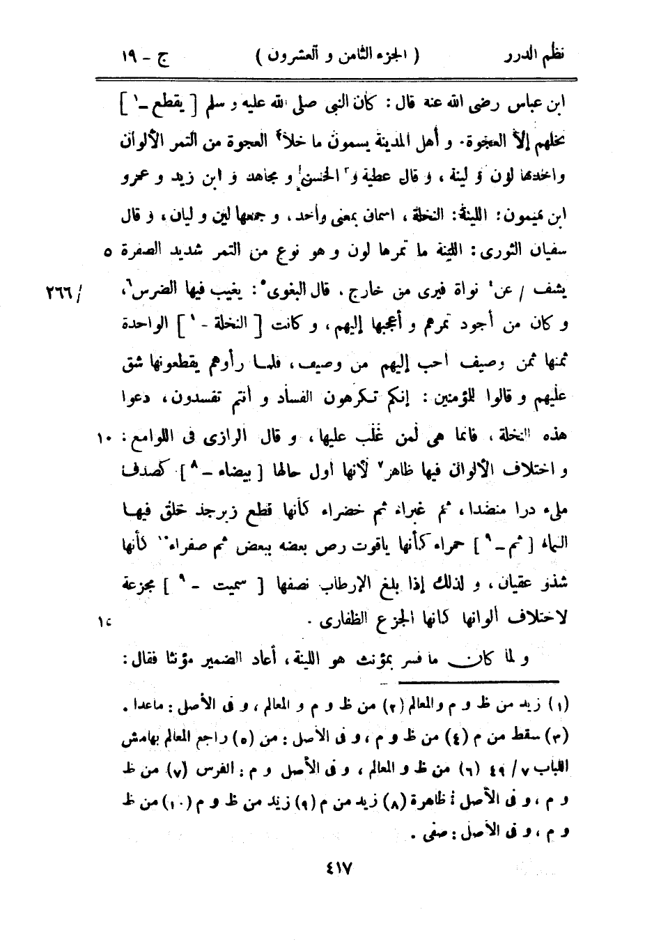 ابن عباس رضي الله عنه قال: كان النبي صَلَّى اللهُ عَلَيْهِ وَسَلَّمَ يقطع نخلهم إلا العجوة. وأهل المدينة يسمون ما خلا العجوة من التمر الألوان واحدها لون ولينة، وقال عطية والحسن ومجاهد وابن زيد وعمرو بن ميمون: اللينة: النخلة، اسمان بمعنى واحد، وجمعها لين وليان، وقال سفيان الثوري: اللينة ما تمرها لون وهو نوع من التمر شديد الصفرة يشف عن نواة فيرى من خارج، قال البغوي: يغيب فيها الضرس، وكان من أجود تمرهم وأعجبها إليهم، وكانت النخلة الواحدة ثمنها ثمن وصيف أحب إليهم من وصيف، فلما رأوهم يقطعونها شق عليهم وقالوا للمؤمنين: إنكم تكرهون الفساد وأنتم تفسدون، دعوا هذه النخلة، فإنما هي لمن غلب عليها، وقال الرازي في اللوامع واختلاف الألوان فيها ظاهر لأنها أول حالها بيضاء كصدف مليء درّاً منضداً، ثم غبراء ثم خضراء كأنها قطع زبرجد خلق فيها الماء ثم حمراء كأنها ياقوت رص بعضه ببعض ثم صفراء كأنها شذو عقيان، ولذلك إذا بلغ الإرطاب نصفها سميت مجزعة لاختلاف ألوانها الجزع الظفاري.