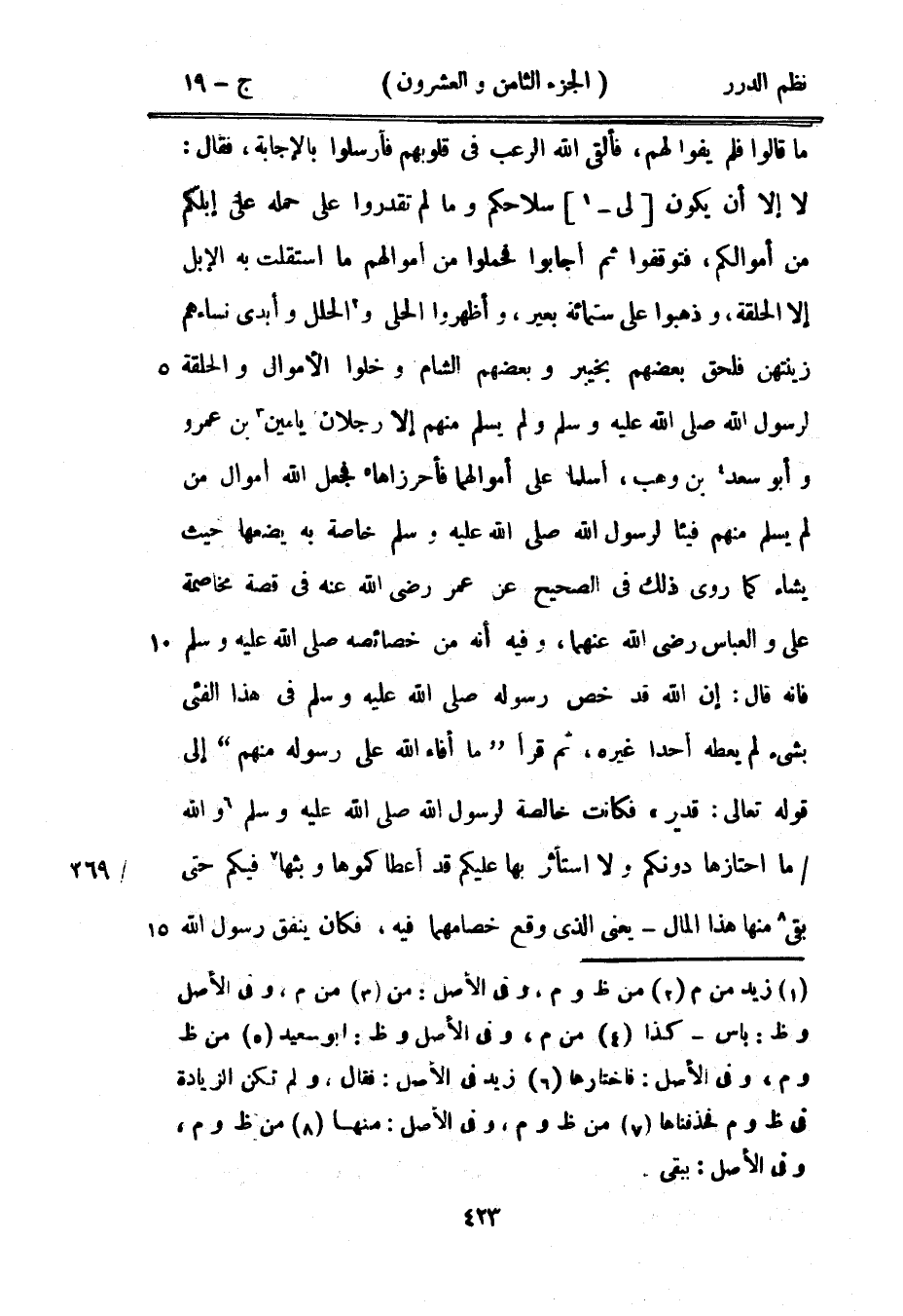 ما قالوا فلم يفوا لهم، فألقى الله الرعب في قلوبهم فأرسلوا بالإجابة، فقال: لا إلا أن يكون لي سلاحكم وما لم تقدروا على حمله على إبلكم من أموالكم، فتوقفوا ثم أجابوا فحملوا من أموالهم ما استقلت به الإبل إلا الحلقة، وذهبوا على ستمائة بعير، وأظهروا الحلي والحلل وأبدى نساؤهم زينتهن فلحق بعضهم بخيبر وبعضهم بالشام وخلوا الأموال والحلقة لرسول الله صَلَّى اللهُ عَلَيْهِ وَسَلَّمَ ولم يسلم منهم إلا رجلان يامين بن عمرو وأبو سعد بن وهب، أسلما على أموالهما فأحرزاها فجعل الله أموال من لم يسلم منهم فيئاً لرسول الله صَلَّى اللهُ عَلَيْهِ وَسَلَّمَ خاصة به يضعها حيث يشاء كما روي ذلك في الصحيح عن عمر رضي الله عنه في قصة مخاصمة علي والعباس رضي الله عنهما، وفيه أنه من خصائصه صَلَّى اللهُ عَلَيْهِ وَسَلَّمَ فإنه قال: إن الله قد خص رسوله صَلَّى اللهُ عَلَيْهِ وَسَلَّمَ في هذا الفيء بشيء لم يعطه أحداً غيره، ثم قرأ {ما أفاء الله على رسوله منهم} إلى قوله تعالى: {قدير} فكانت خالصة لرسول الله صَلَّى اللهُ عَلَيْهِ وَسَلَّمَ والله ما احتازها دونكم ولا استأثر بها عليكم قد أعطاكموها وبثها فيكم حتى بقي منها هذا المال - يعني الذي وقع خصامهما فيه، فكان ينفق رسول الله صَلَّى اللهُ عَلَيْهِ وَسَلَّمَ